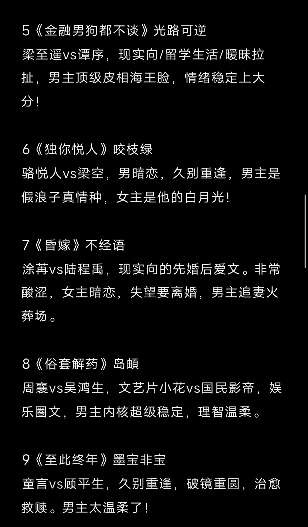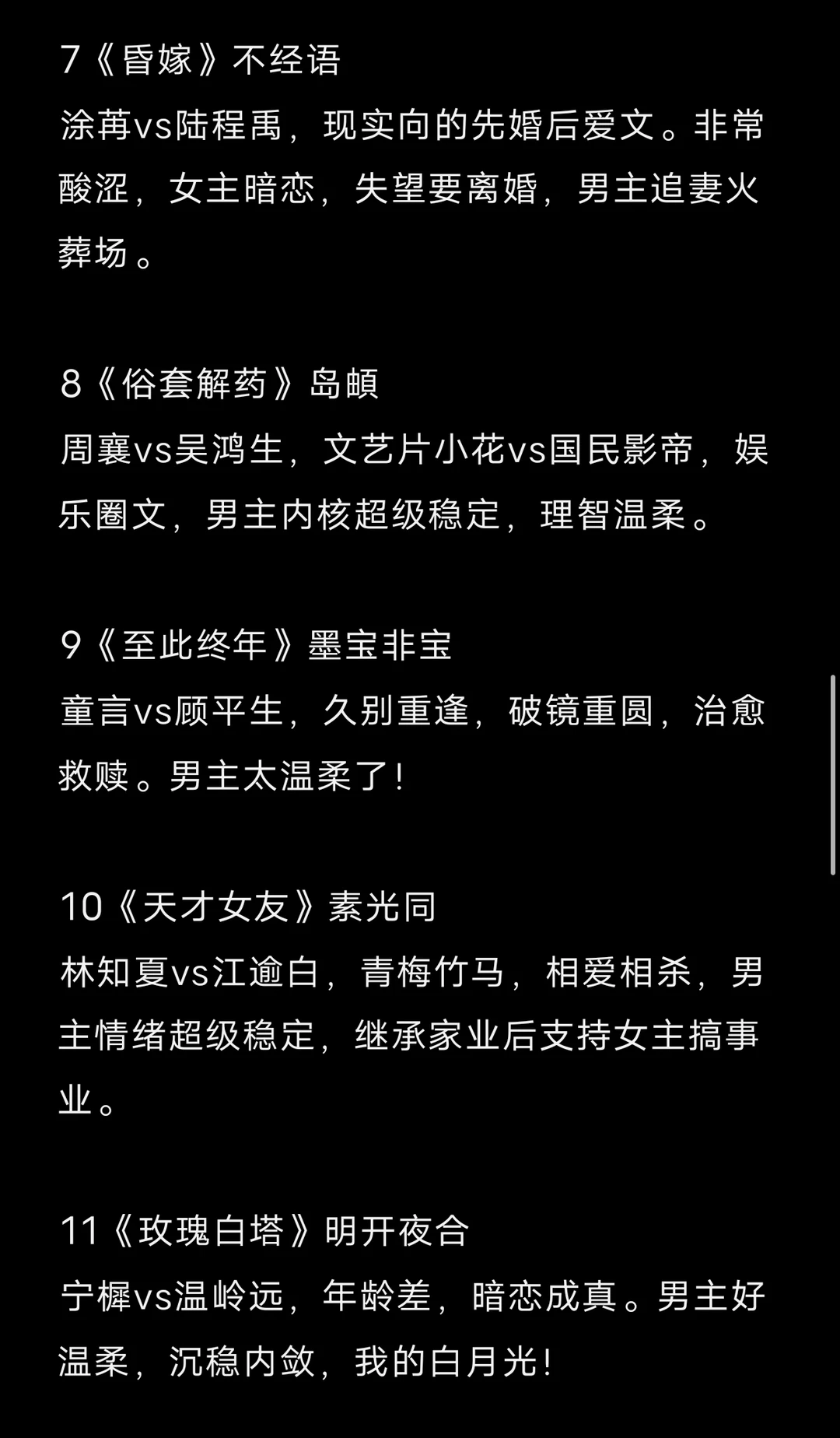 先婚后爱/暗恋成真/追妻火葬场/年龄差/久别重逢/破镜重圆 1《港遇及时雨》糯米白年糕 2《左边》含胭 3《今日宜动婚》金宝朱 4《爱情万岁》咚咚锵 5《金融男狗都不谈》光路可逆 6《独你悦人》咬枝绿 7《昏嫁》不经语 8《俗套解药》岛頔 9《至此终年》墨宝非宝 10《天才女友》素光同 11《玫瑰白塔》明开夜合