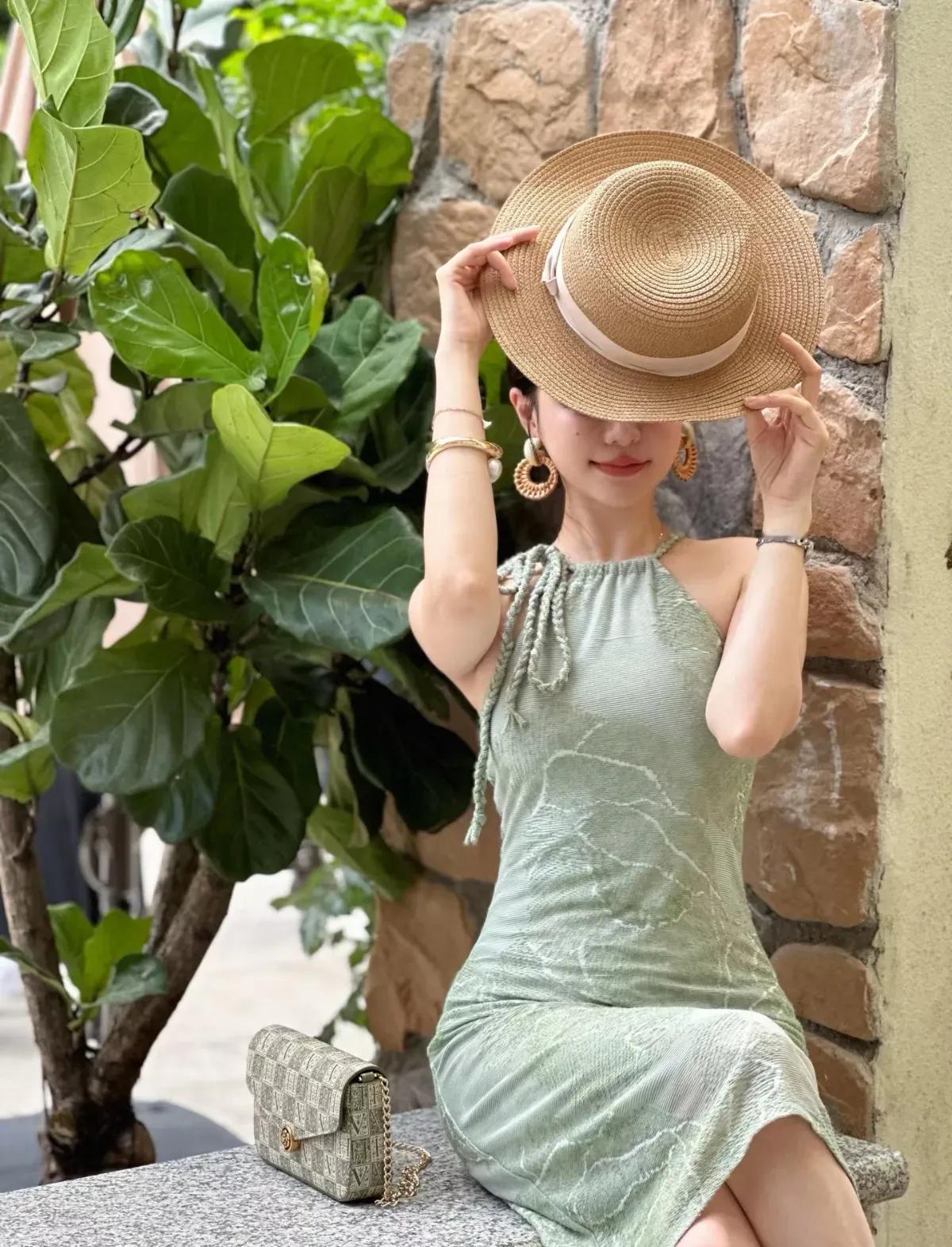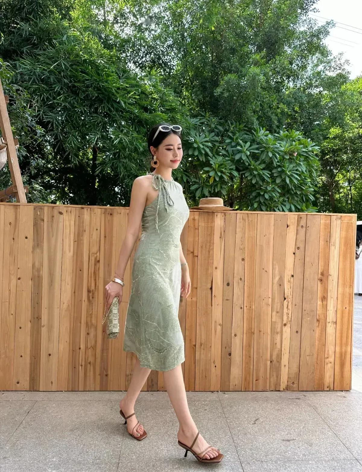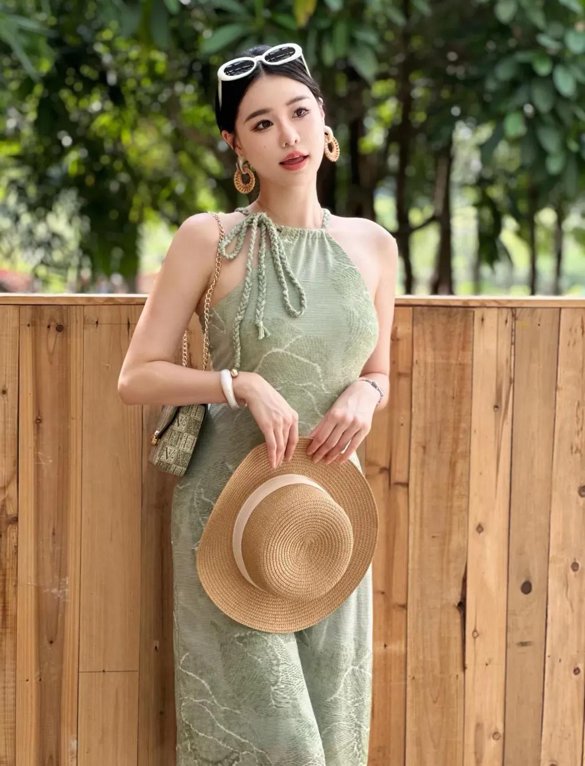 这套穿搭是清新优雅的薄荷绿挂脖裙度假风,把夏日松弛感和精致女人味融合得很出彩。薄荷绿挂脖连衣裙自带清新氛围,挂脖设计露出肩颈线条,注入轻熟感;修身版型凸显身形,中长裙摆得体又显温柔。 草编帽+浅棕凉鞋强化度假调性,和自然布景呼应;金属耳环+链条包增添精致感,让清新造型更显亮眼。淡雅绿连衣裙 薄荷绿系穿搭