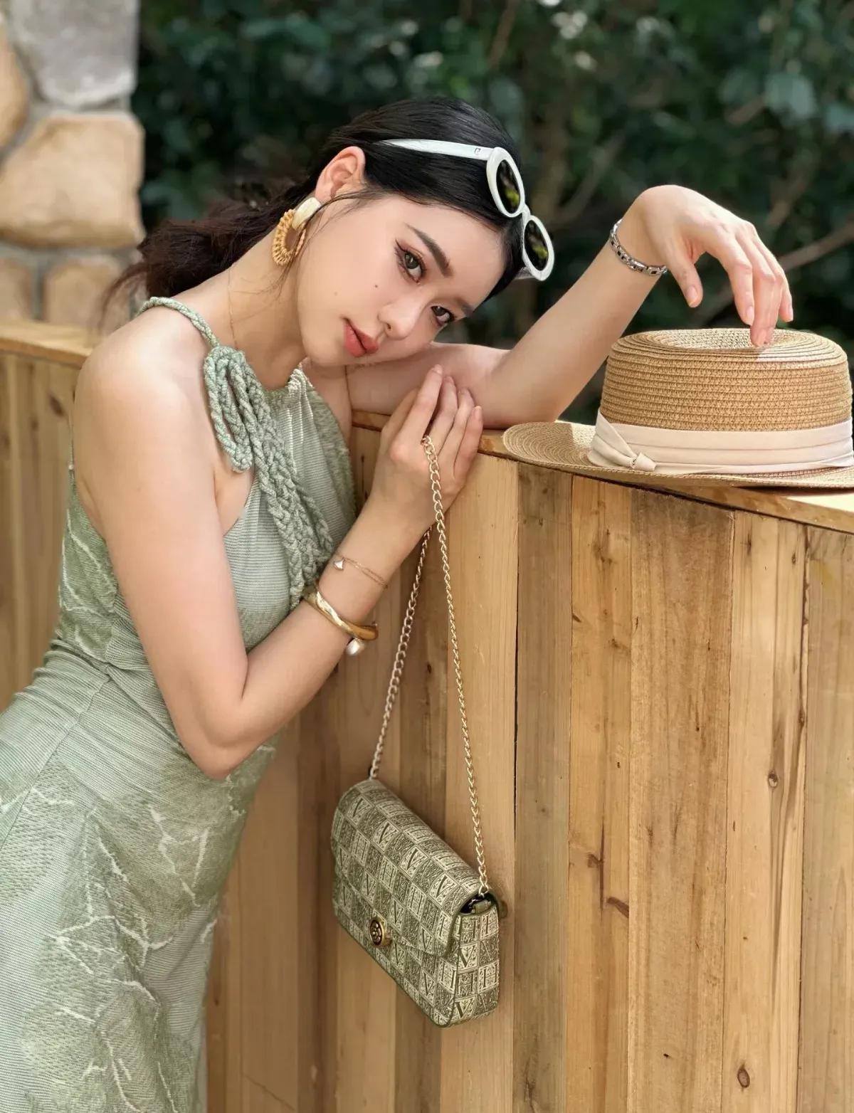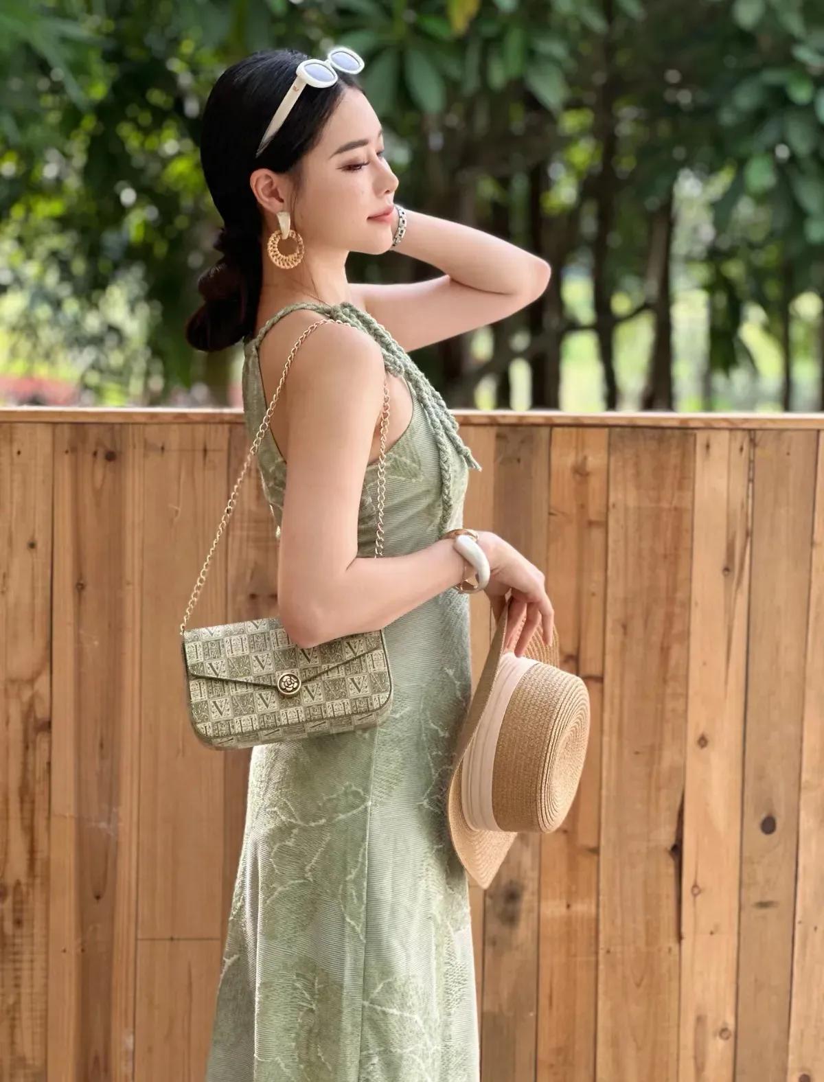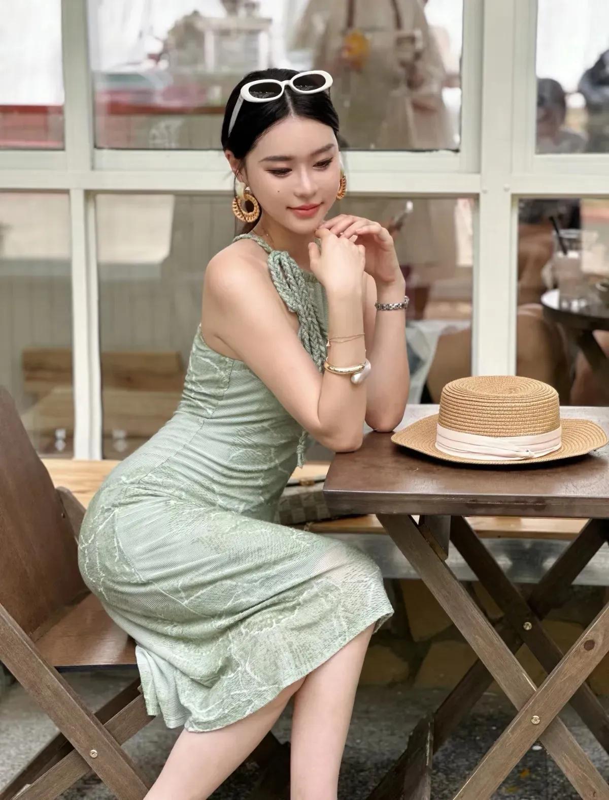 这套穿搭是清新优雅的薄荷绿挂脖裙度假风,把夏日松弛感和精致女人味融合得很出彩。薄荷绿挂脖连衣裙自带清新氛围,挂脖设计露出肩颈线条,注入轻熟感;修身版型凸显身形,中长裙摆得体又显温柔。 草编帽+浅棕凉鞋强化度假调性,和自然布景呼应;金属耳环+链条包增添精致感,让清新造型更显亮眼。淡雅绿连衣裙 薄荷绿系穿搭