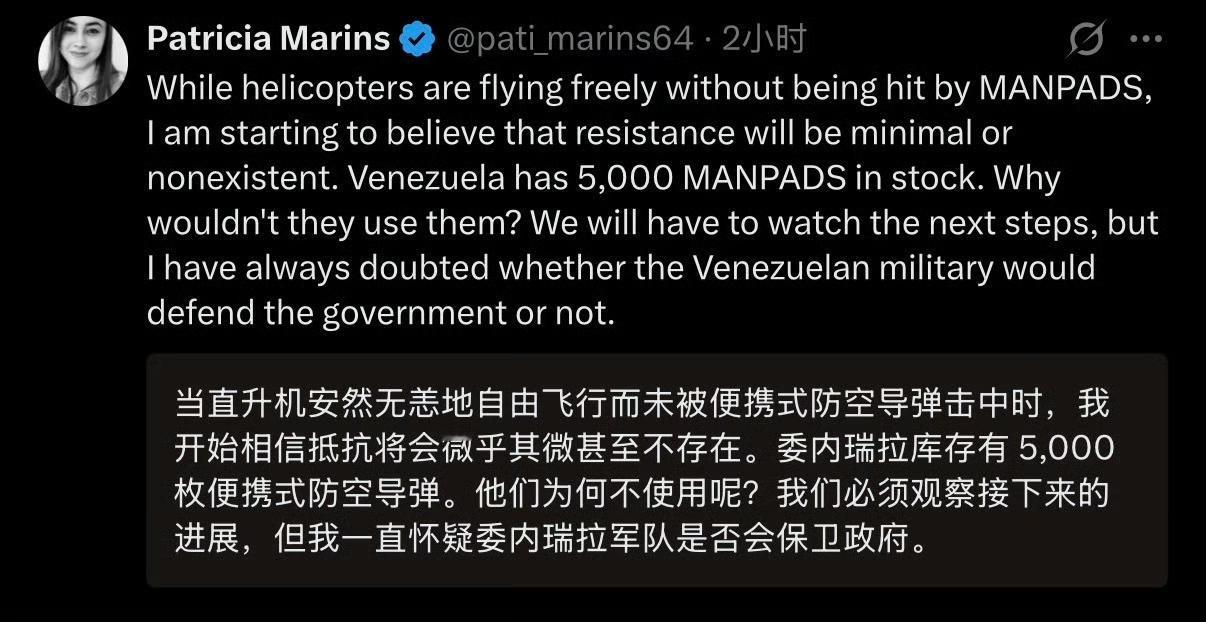 这就离谱了,特朗普说委内瑞拉总统马杜罗和他的家人已经被美军抓走了 委内瑞拉准备了这么久,结果美军一个突袭,总统直接没了? 据美媒消息,三角洲特种部队抓获的马杜罗夫妇。 从美军空袭过程,包括可能的“俘获马杜罗”来看委内瑞拉防空部队并未做出强烈反应。 极有可能与当年入侵伊拉克一样,事先买通了军队指挥官。 拉美媒体人和网友普遍认为老马是被卖了。