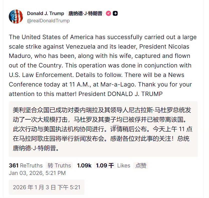 快讯:特朗普宣布美军已抓走马杜罗夫妇。 与此同时,委内瑞拉军队还在街头部署,这下未来走向更扑朔迷离了。 特朗普:“美利坚合众国已成功对委内瑞拉及其领导人尼古拉斯·马杜罗总统发动了一次大规模打击,马杜罗及其妻子均已被俘并已被带离该国。此次行动与美国执法机构协同进行。详情稍后公布。今天上午 11 点在马拉阿歌庄园将举行新闻发布会。感谢各位对此事的关注!总统唐纳德·J·特朗普。” 这下好了,特朗普取得了任内重大胜利。牛啊,美国虐菜的手艺还是传下来了,1小时22分特别捕获行动。 这是给咱们打样了,学学美利坚,至于是不是打样,就看赖桑怎么想了。