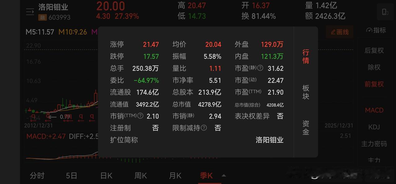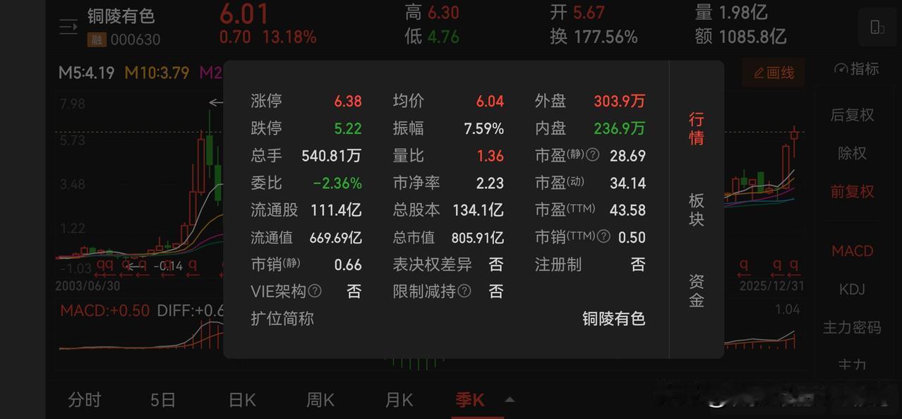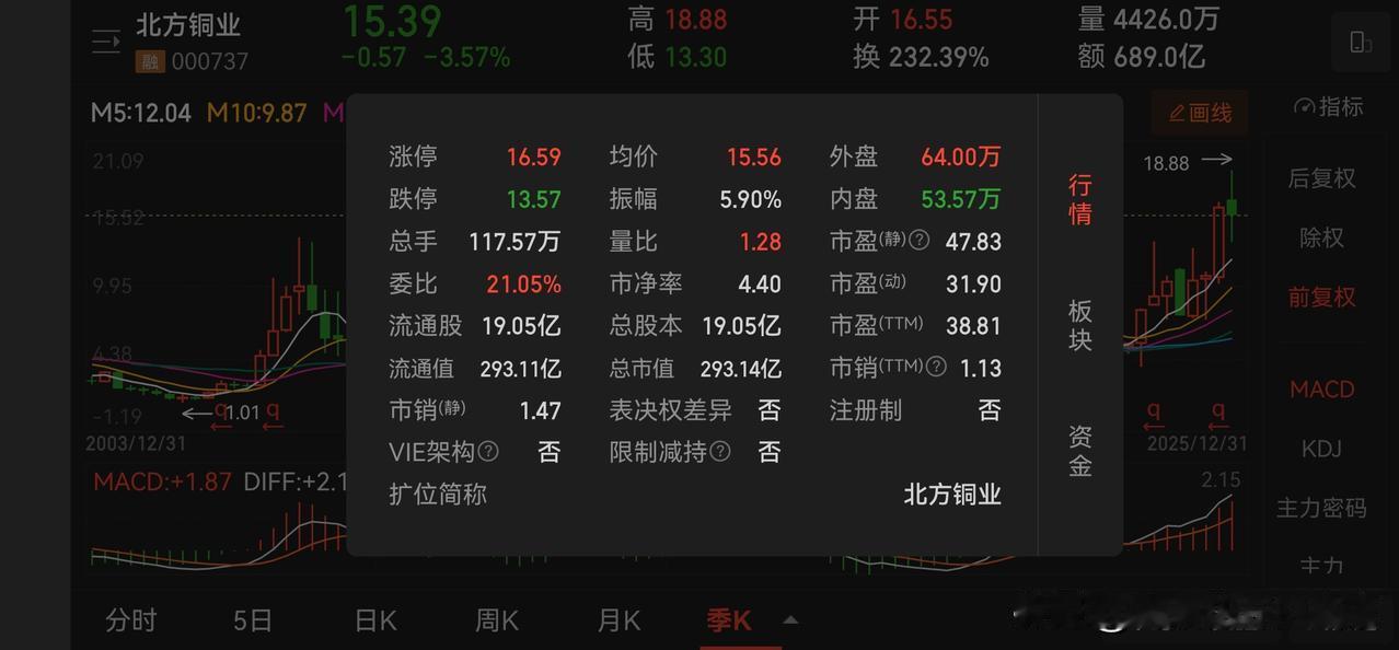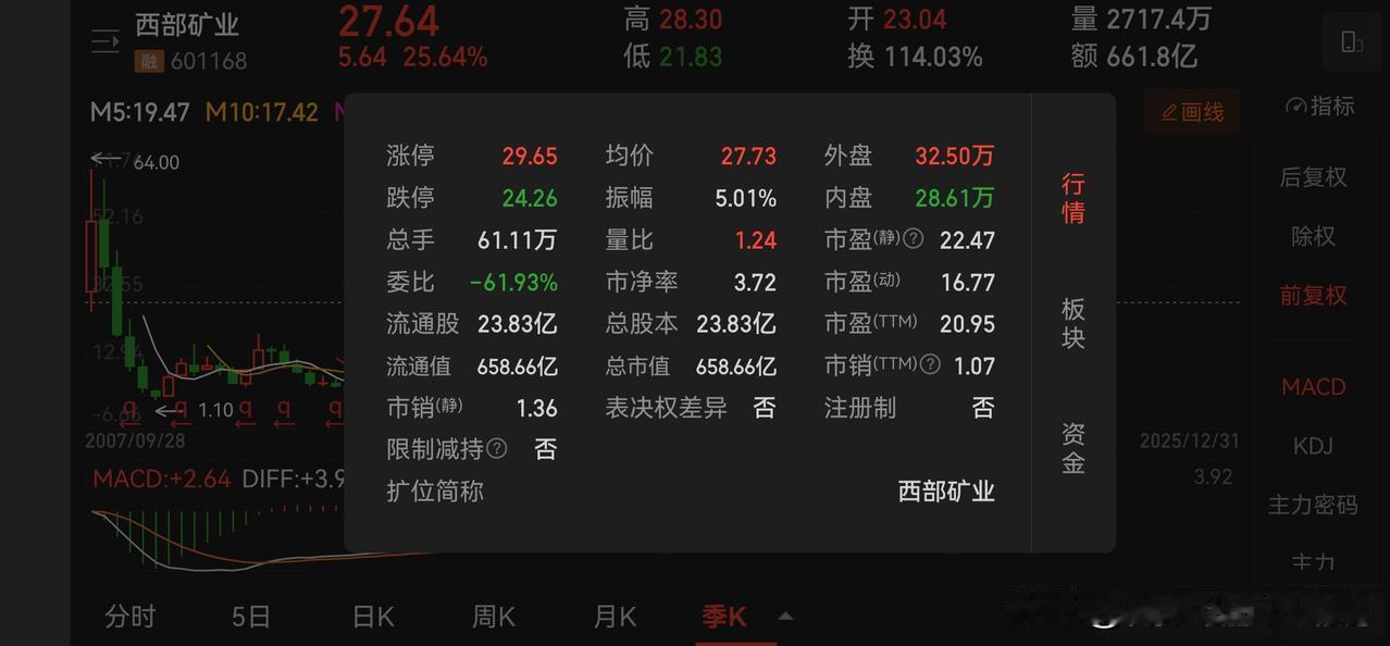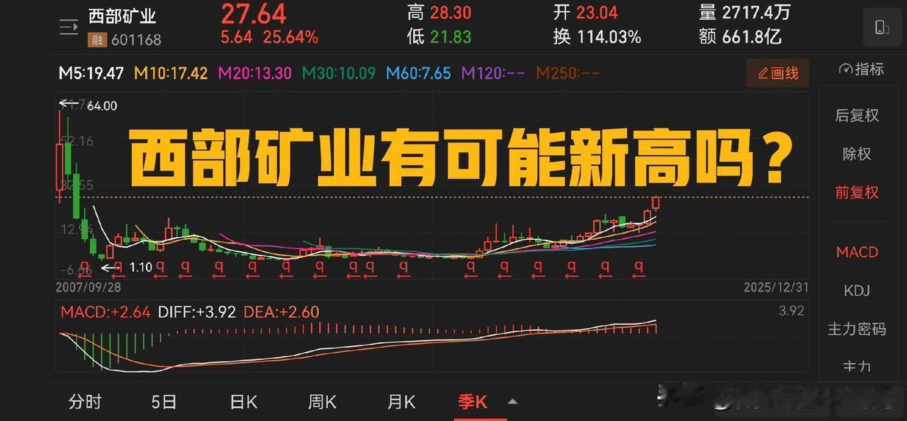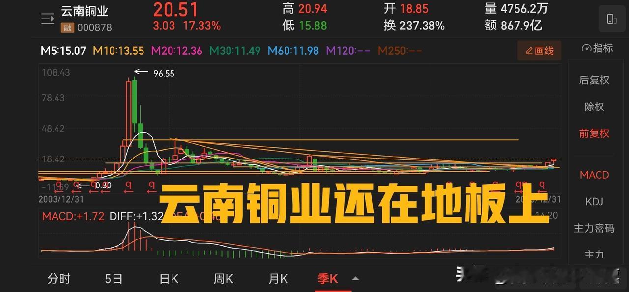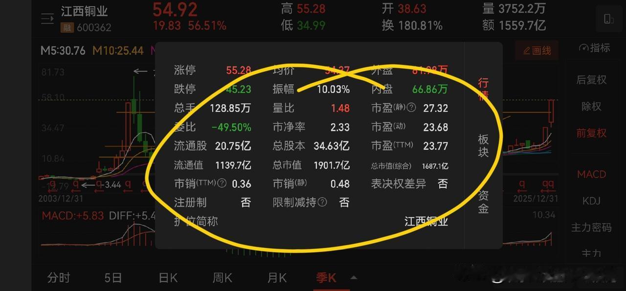 南方铜业是大牛股,一路向北,这一点远好于大 A 有色品种的宽幅震荡。江西铜业两个季度涨上来,牛股身份已经确立,让我们思考两个问题。 一个问题是:如果你有一笔资金,在云南铜业和江西铜业中二选一,现在哪一个更适合投资? 第二个问题:西部矿业这一波有可能新高吗? 江西铜业新高只需要再涨 30%+,西部矿业需要翻倍再多一点,而云南铜业需要涨四倍才行。 西部矿业上市后最高冲到 64,一路跌到最低 1.1,如果从最高点进去,基本上可以说毛都不剩,接近二十年的时间目前还在腰斩状态。这一波到底能不能回去?我觉得不容易。 我们看紫金矿业、洛阳钼业、铜陵有色、北方铜业等一系列铜业股的数据,云南铜业现在的市净率、市盈率、市销率、市值,都属于偏低的,云铜最高市值接近 2000 亿,和江西铜业目前的市值差不多,但是现在只有最高点的 20% 或 410 亿。 我对云铜的期待,首先是回到千亿市值。 梦想要有的,万一实现了呢。