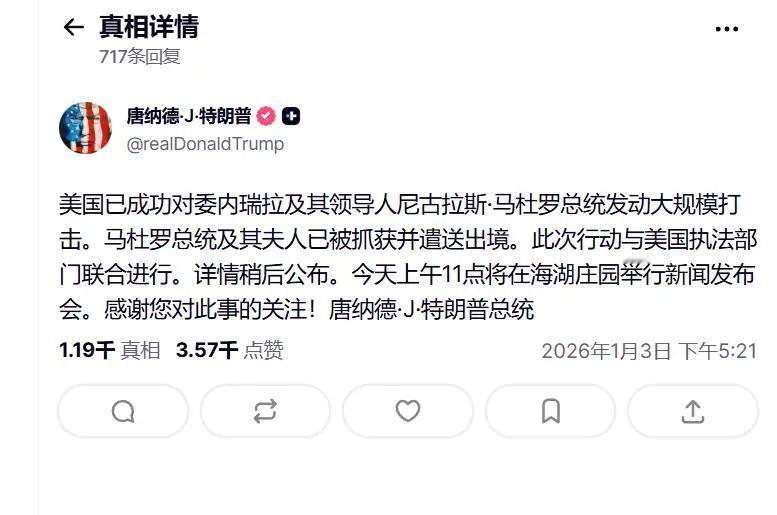 重磅消息:当地时间1月3日下午54:21分:特朗普称已抓获委内瑞拉总统 。新华社也对此消息进行了报道。 如果这事是真的,并且委内瑞拉没有屈服与美国开战,只要美国没能在短时间内结束、使战争进入相持阶段,只能说,我们完成梧桐的机会来了。 但,若天予不取,则反受其咎。