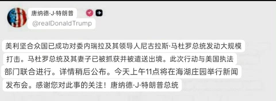 特朗普:美利坚合众国已成功对委内瑞拉及其领导人尼古拉斯·马杜罗总统实施大规模打击