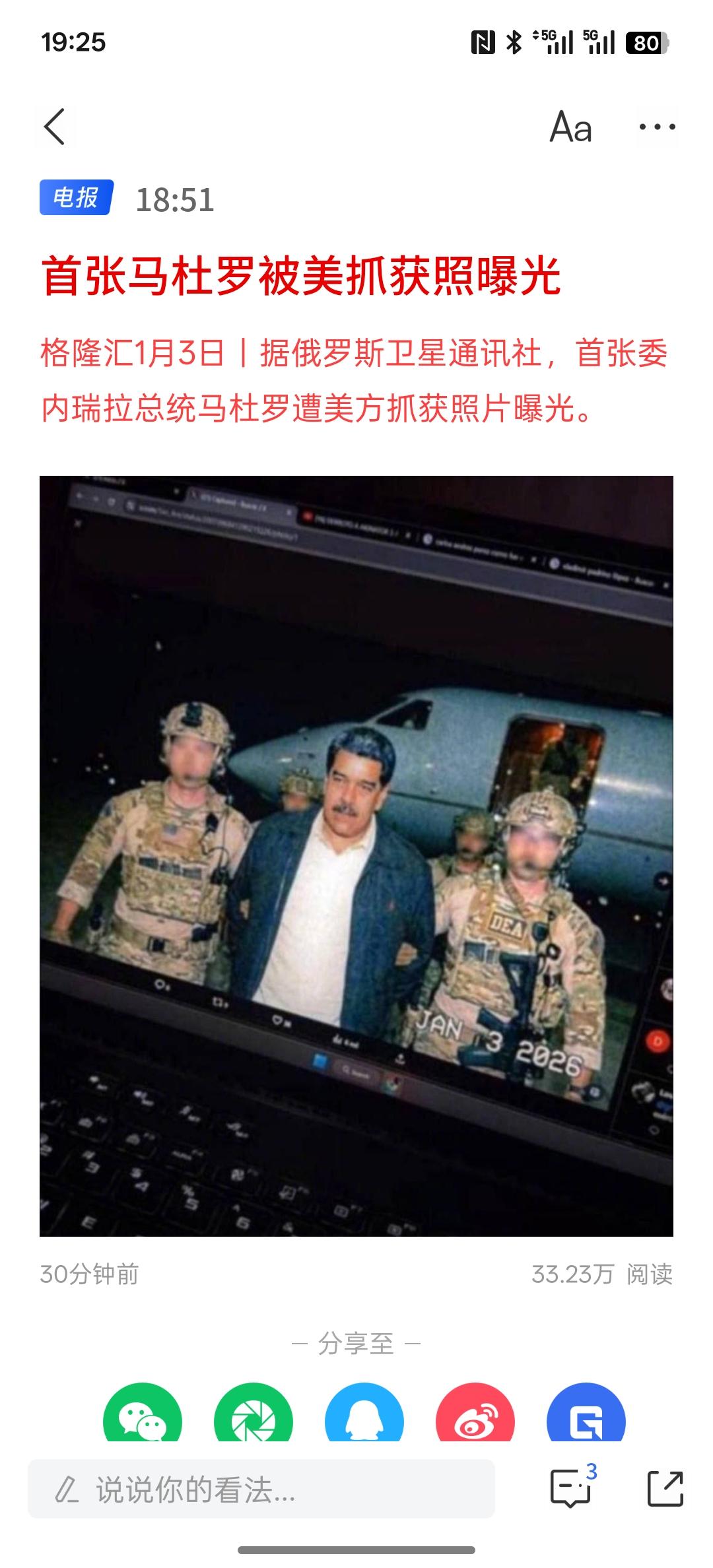 疑似首张马杜罗被美抓获照曝光,俄罗斯通讯社的消息,据说马杜罗已经被美军抓了!如果真的被抓了,那委内瑞拉国内会不会出现混乱? 目前委内瑞拉国内非常的恐慌,当地民众的拍摄!夜晚有多家美军战机在委内瑞拉进行低空飞行,对委内瑞拉发动了空袭,当地华人也拍摄了相关空袭的画面!直到目前为止,伤亡仍然没有明确!那还要等待!如果按照国际法,这属于侵略行为吗?