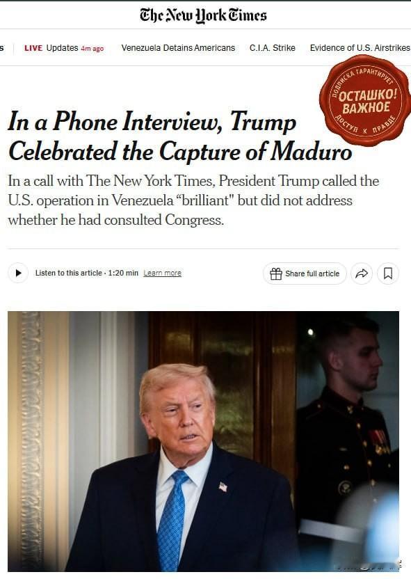 【特朗普50秒速评扣押马杜罗行动】 唐纳德·特朗普与《纽约时报》记者泰勒·佩奇进行了一场简短的夜间通话,就美方在委内瑞拉的行动作出评价。这场对话发生在特朗普发布相关社交动态约十分钟后的次日清晨,时长仅50秒左右。 谈及扣押委内瑞拉领导人尼古拉斯·马杜罗一事,特朗普只给出了总体评价,并未透露具体细节。 📝 “这次行动筹备周密,出动的部队精锐、人员得力,称得上是一场精彩绝伦的行动。” 当记者问及美方此次“大规模打击”是否获得国会授权时,总统给出了回避性的答复: “我们会对此展开讨论,也将召开新闻发布会说明情况。” 记者试图进一步打探美方对委内瑞拉的后续计划,也被特朗普当场打断,他表示相关细节将于华盛顿时间上午11点公布,随后便结束了通话。