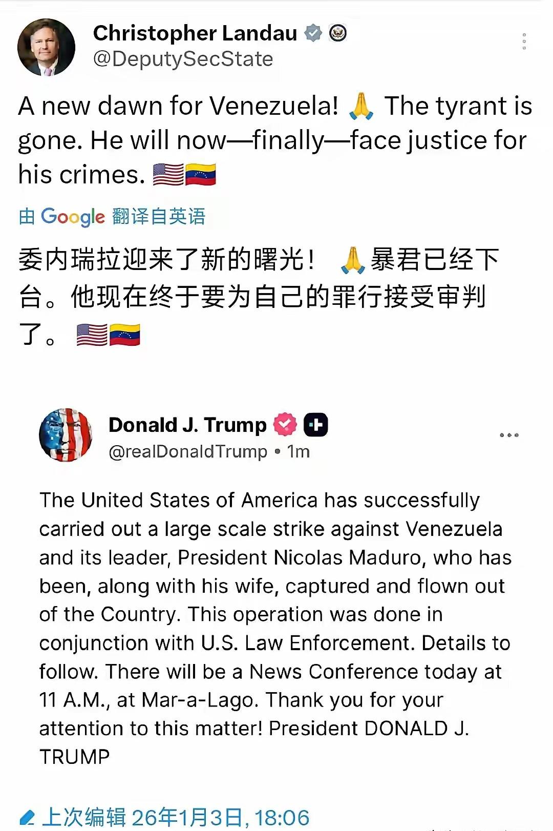 重磅消息!美军突袭委内瑞拉! 当地时间2026年1月3日凌晨,美军趁着委内瑞拉人