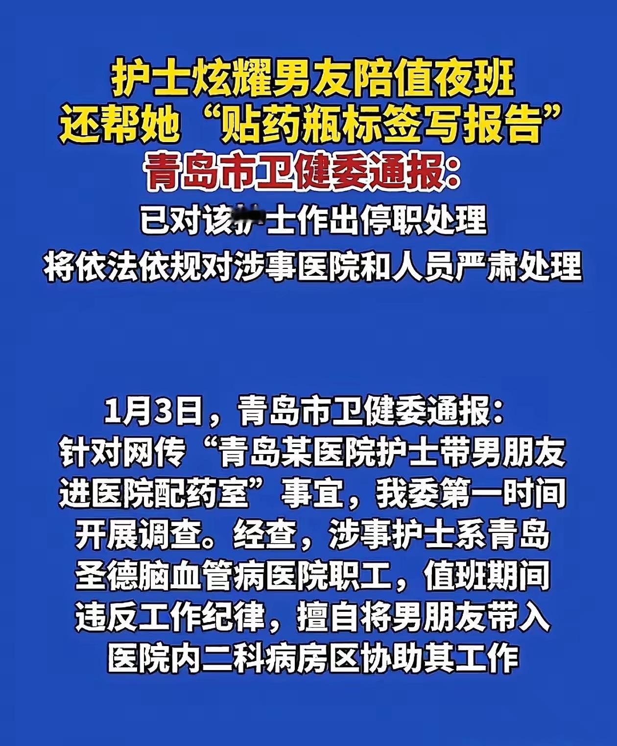 这下真“炫耀”出事了!青岛一位女护士,本来大概是想秀个恩爱,把男友陪自己值夜班的照片或视频晒了出来。没想到,这一“晒”直接把工作“晒”没了——当地卫健委通报,这位护士已经被停职了。 这事看着像是“秀恩爱翻车”,但细想之下,卫健委的迅速处理,其实戳破了一个我们可能都忽略了的常识:医院,尤其是夜间的值班岗位,从来都不是可以随意“共享”的私人空间。 我们可以想象一下那个场景:深夜的病区,灯光昏暗,大部分患者已经休息,正是需要高度专注和安静的时候。一个非工作人员的突然出现,无论其初衷如何,本身就打破了这种专业环境所需要的密闭性与安全感。患者看到会怎么想?其他值班同事又会作何感受?这绝不是简单的“陪伴”,而是对职业底线的一次无意间的逾越。 更值得深思的是通报中的另一句话:“将严肃处理医院和相关责任人”。这说明,管理上的漏洞同样被审视。男友是如何顺利进入值班区域的?医院的夜间门禁管理和巡查制度是否存在疏漏?这次处理不仅指向个人,更指向了整个管理链条。这传递出一个清晰的信号:在医疗安全面前,任何环节的失守都是不被允许的。 所以,这件事给所有人的启示,远比“不要乱发朋友圈”来得深刻。它关乎我们每个人对自身职业的敬畏心——有些岗位的纪律是带电的高压线,容不得半点私人情绪的“分享”。它也关乎公共场所的安全信任,尤其是医院这样的特殊环境。下一次,当我们因为亲友在某个岗位工作就想“行个方便”时,或许该先想一想,我们方便的背后,是否正在拆解保障他人安全的围栏。
