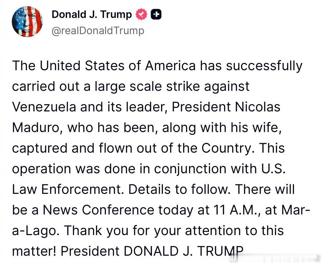 特朗普称已抓获委内瑞拉总统最新消息!懂王正式官宣,委内瑞拉总统马杜罗和妻子已被抓获,这个速度真的太快了。不得不说,老美在对待比它弱的国家是够狠的。。