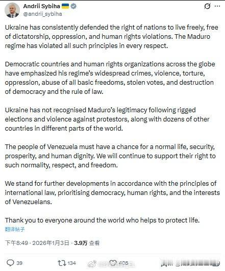 委内瑞拉总统马杜罗被美国大大方方的入侵抓走,乌克兰外交部长西比哈对此发表评论,表示欢迎。 西比哈在其社交媒体发文称,“乌克兰一贯捍卫各国自由生活的权利,反对独裁、压迫和侵犯人权的行径。马杜罗政权在所有方面都违背了所有这些原则。 西比哈还表示,全球范围内的民主国家和人权组织均强调了马杜罗政权所犯下的广泛罪行、暴力行为、酷刑折磨、压迫行径、对所有基本自由的践踏、窃取选票以及破坏民主与法治的行为。 西比哈还指出,在马杜罗通过舞弊选举和对抗议者暴力镇压之后,乌克兰和世界上其他数十个国家,均未承认其合法性。委内瑞拉人民必须有机会过上正常生活、获得安全、繁荣和人类尊严。 西比哈还强调,乌克兰将继续支持委内瑞拉享有正常的尊重与自由的权利。乌克兰支持根据国际法原则推进进一步发展,优先保障民主、人权和委内瑞拉人民的利益。