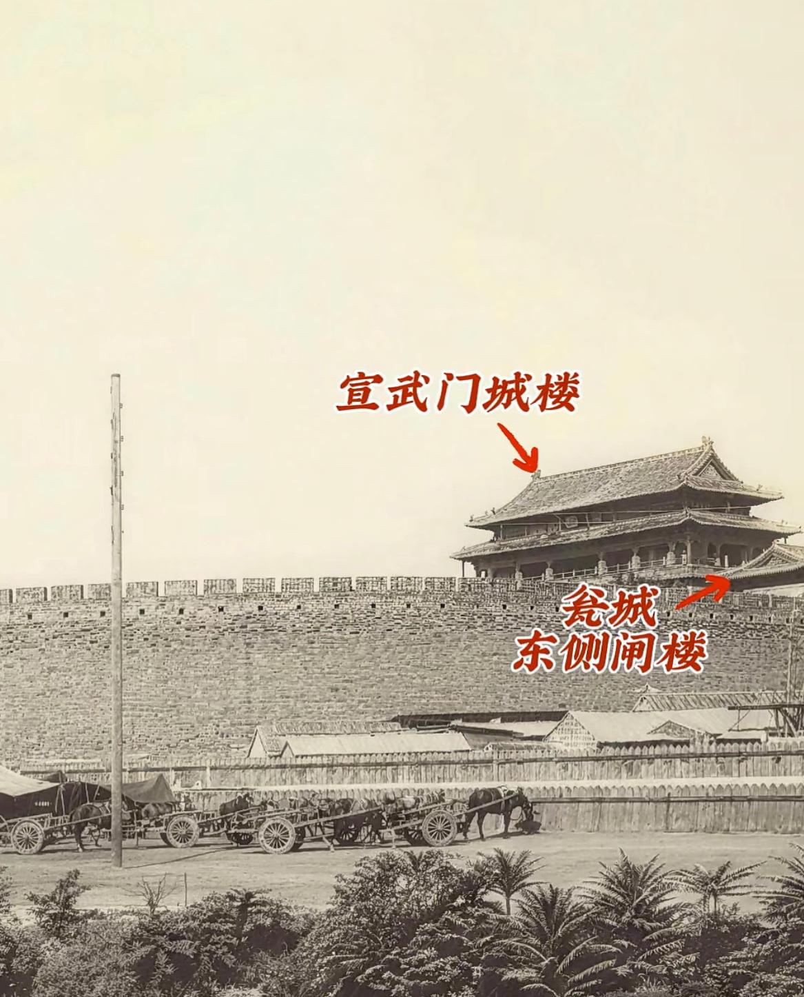 老照片:约1916年,北京内城宣武门全景。 当时清朝刚刚灭亡没几年,宣武门城墙下除了房屋,还搭着一些帐篷,有不少马车停着,应该是驾驶马车进北京时的最后一个休息站。 老照片 北京