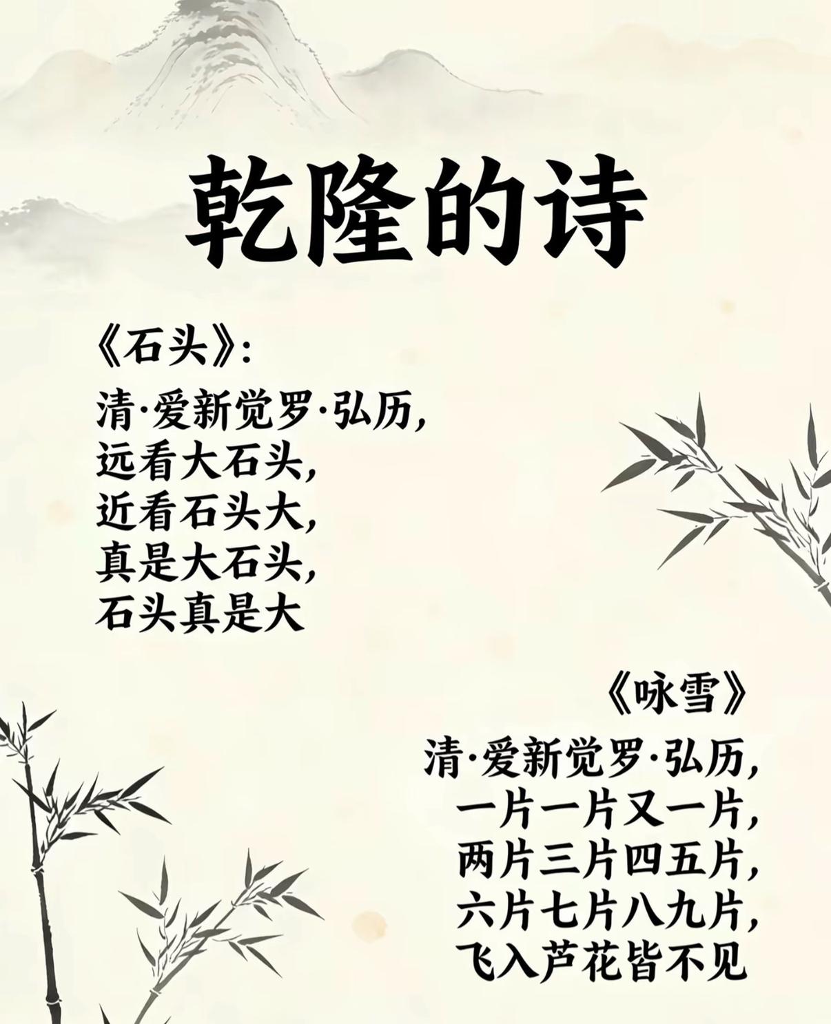 你一定不知道的事,清朝的乾隆是一位不折不扣的写诗狂人,一生总共写了43630首诗,是历史上写诗最多的人,但是乾隆的诗只是数量多、质量是较低的。 我们来看两首就知道,乾隆写了一首《石头》: 远看大石头,近看石头大,真是大石头,石头真是大。还有一首《咏雪》:一片一片又一片,两片三片四五片,六片七片八九片,飞入芦花皆不见。你看这内容扯不扯吧[笑哭],这个写诗的频率放到现在就是典型的网瘾少年,又菜又爱玩。 乾隆 清朝 古代