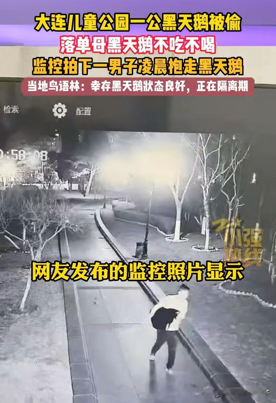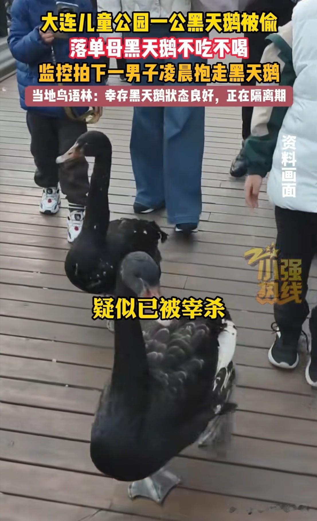 真的是又蠢又坏!辽宁,男子以为跨年夜人都去庆祝了,没有人会注意,他就偷偷跑进大连儿童公园,趁着天黑抱走了园区的一只黑天鹅。 可惜这一幕被监控拍的清清楚楚,很快警察就根据照片锁定了男子,第2天就将男子抓住了,可惜那只黑天鹅已经被男子吃掉了,目前男子已被拘留。 公园一共有2只天鹅,它们是一对夫妻,公天鹅叫达达,母天鹅叫优优,平时非常受小孩子的喜爱,是公园的“小明星”,达达被偷走后,优优好几天不吃不喝,园区只能把它送到了鸟语林单独照顾。 我查了一下,黑天鹅虽不是保护动物,但男子这种行为必须严惩,已经严重伤害了大家对美好事物的喜爱之心。真的是有那么馋,凌晨不睡觉去把天鹅抱走,还连夜弄来吃了。 突然想起一句话:癞蛤蟆想吃天鹅肉!