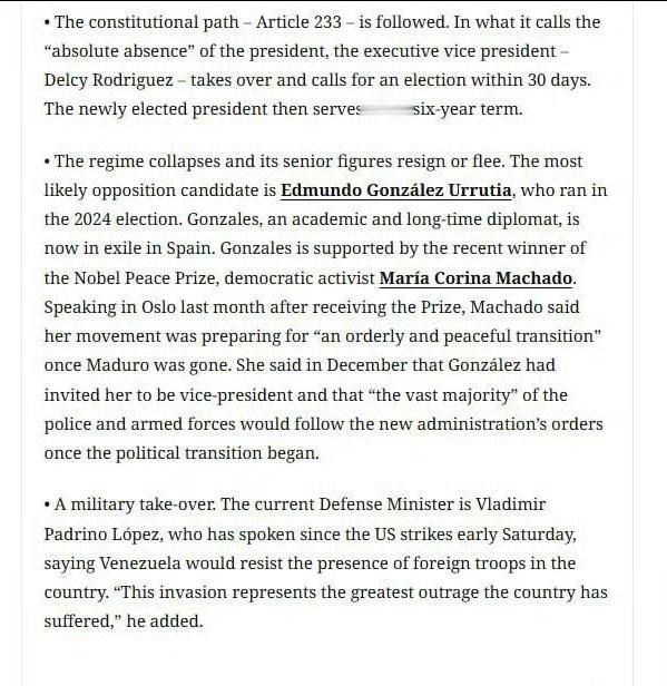 CNN预测美军袭击后委内瑞拉局势的三种可能发展方向: ▪️宪政过渡:权力移交给副总统德尔西·罗德里格斯,根据法律,她必须在 30 天内举行新的选举。(但是这种时候谈法律就有点幽默了) ▪️反对派崛起:左翼政府垮台,极右翼反对派掌权。在这种情况下,最有可能的新总统是流亡西班牙的埃德蒙多·冈萨雷斯·乌鲁蒂亚,他是 2024 年总统选举的候选人,自己宣布了一个投票结果宣称自己是总统,目前得到欧盟、日本、以色列、阿根廷等国的支持。 ▪️军事政变:国防部长弗拉基米尔·帕德里诺·洛佩斯发动军事政变夺取政权,建立军政府。