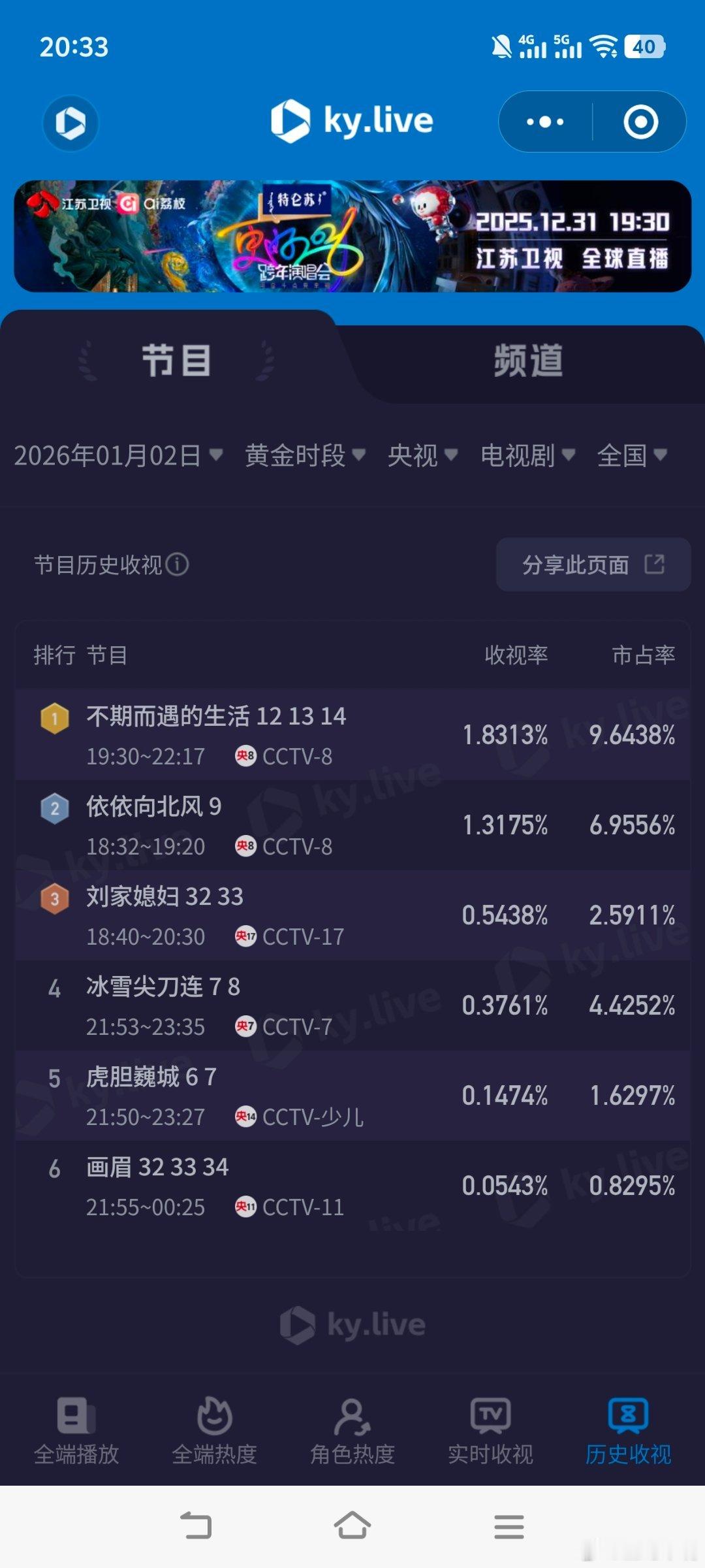 1月2日cvb收视日报不期而遇的生活1.575,酷云1.8313,系数0.860长河落日 京0.392,酷云0.3688,系数1.063长河落日 浙0.341,酷云0.3502,系数0.974玉茗茶骨0.255,酷云0.4040,系数0.631
