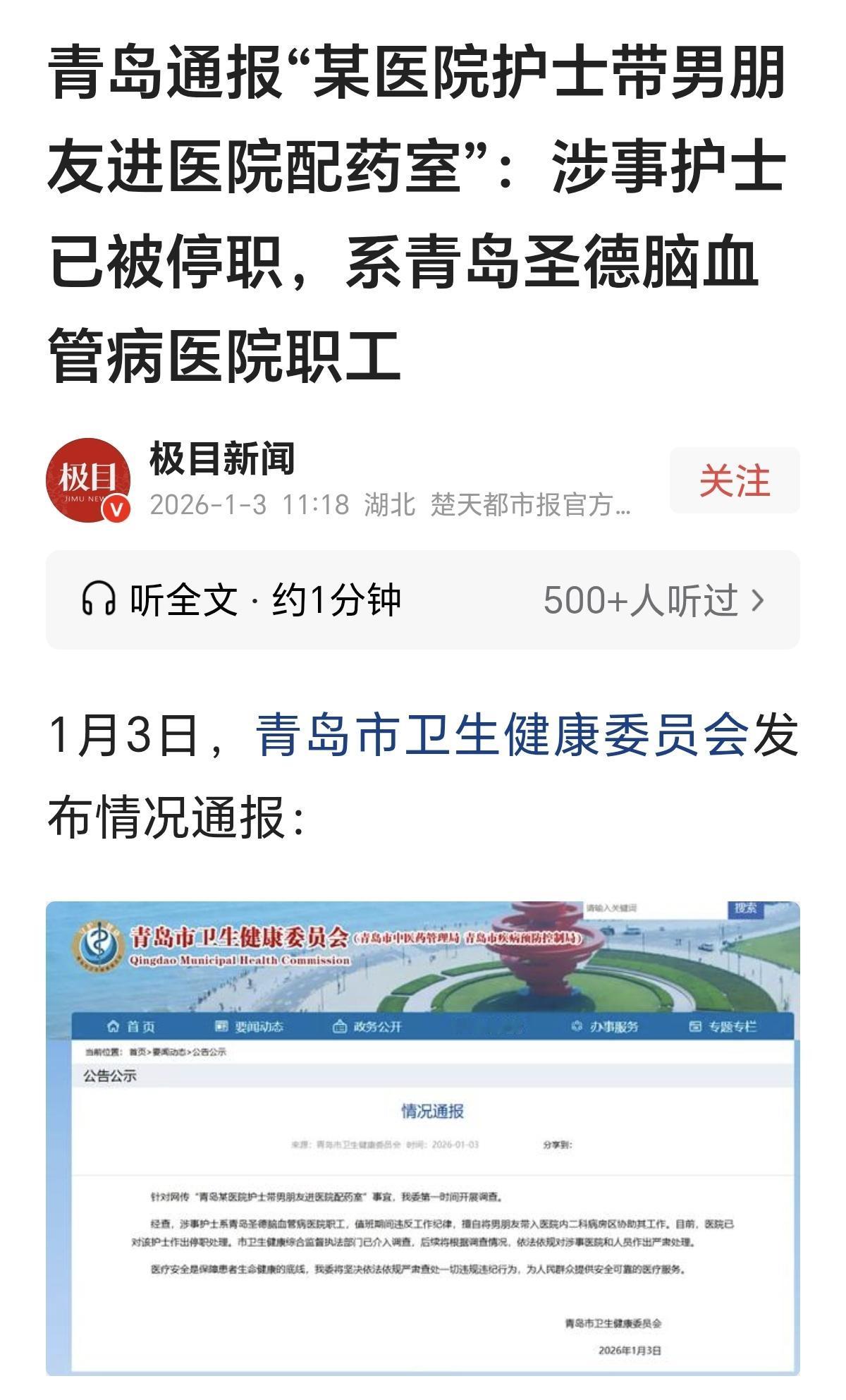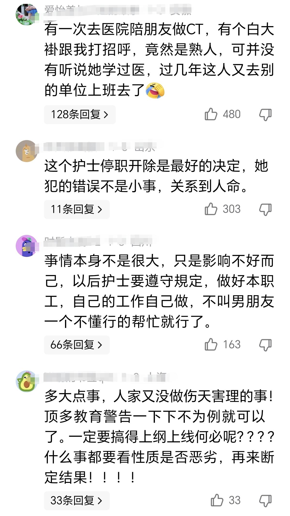 “玩大了!”青岛某医院护士不仅发视频炫耀男朋友陪她值夜班,更不可思议的是,她竟然让男朋友在护士站帮她揉肩、搬货,甚至在护士台帮她写报告,还帮她配药,给点滴瓶贴标签。 她本打算秀恩爱,可网友们看了就不淡定了。 男朋友关心她无可厚非,但这样的方式就过火了。 如果这样也可以,谁还敢去那个医院就医? 这不是拿病患的健康,甚至是生命安全开玩笑嘛! 据报道,该护士已经被停职。 有的网友说,她犯的错误不是小事,停职是正确的决定。 有的网友说,病患的健康和生命安全容不得半点马虎,这样的行为不能容忍。 我支持这个观点。 医院是治病救人,救死扶伤的地方,而涉事护士的行为已经看不出半点职业道德和专业精神,医院的决定并不是小题大做,对于触碰底线的行为应该零容忍。 这样的事情发生在值班期间的护士站,我不禁想问,当时就没有别的护士看到这一场景吗? 护士长在做什么,为什么不管? 有部分网友持另外的观点。 有的网友说,带男朋友进护士站就开除,有点过分吧,批评教育就可以了。 有的网友说,多大点事,她又没做伤天害理的事!自己的工作自己做,不该让不懂行的男朋友帮忙。 这个护士不仅心大,而且胆子也大呀! 或许她觉得自己也在场,也会复检男朋友的工作,不会出错。 然而,事故的发生往往都是起源于疏忽和盲目自信,觉得不会有事往往就是危险的信号。 这个护士的行为颠覆了我对护士工作的认知。 医院里怎么会有这样的事! 她被停职一点都不冤。