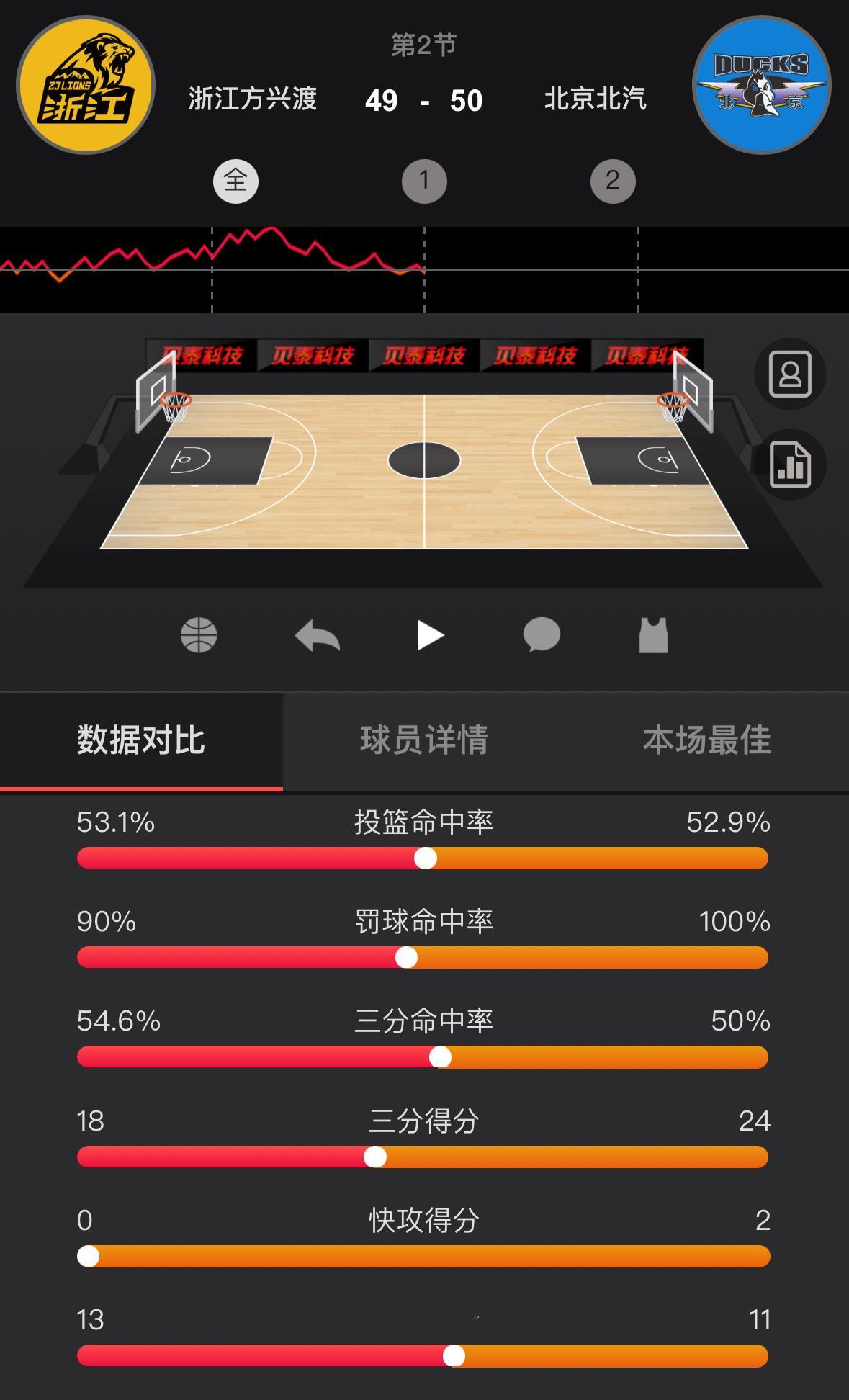 一边没有巴里·布朗,一边没有赵睿,两队上半场投射效率依然惊人,三分都在50%+。