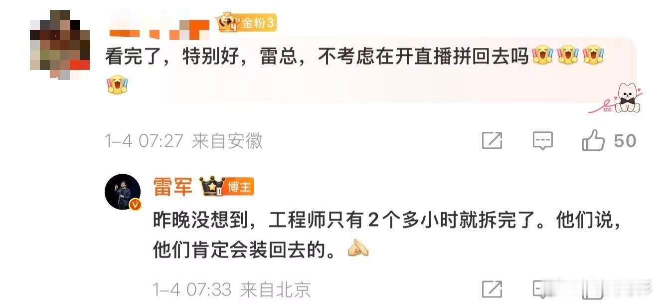 雷军发文感谢看完拆车直播雷军拆车直播车会复原 1月4日,发文感谢看完拆车直播“昨晚的拆车直播好玩吗?4个多小时的硬核直播,居然有不少人看完了,真心感谢!我相信,看过直播后,大家一定会更了解YU7铠甲笼式车身强在哪里,也更了解YU7的安全性。”有网友在评论区问雷军:“看完了,特别好,雷总,不考虑在开直播拼回去吗”雷军回复:“昨晚没想到,工程师只有2个多小时就拆完了。他们说,他们肯定会装回去的。”雷军确认小字营销要改