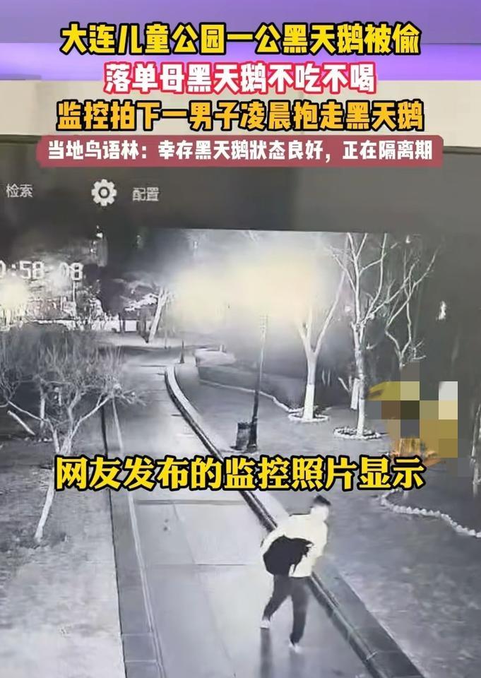 真的是又蠢又坏!元旦前夜,大连儿童公园的黑天鹅“达达”被人抱走了。监控拍得清清楚楚,一个男的在12月31号凌晨0点58分,直接伸手把睡觉的达达抱走,看动作还挺熟练。 公园里原本有两只天鹅,达达和优优是一对。它们平时形影不离,结果达达一没,优优就开始不吃不喝,整天在湖边乱转,看着特别可怜。市民都挺心疼,视频传上网后,大家气坏了。 警察第二天就抓到了人。查下来,达达已经被吃了,嫌疑人现在已经被拘留。那只剩下的母天鹅优优,已经送到老虎滩海洋公园鸟语林,目前状态还行,还在隔离。 这事真让人无语。真的是没吃的了吗,连公园的鹅都偷,虽说黑天鹅不是保护动物,可这行为真够让人瞧不起的。