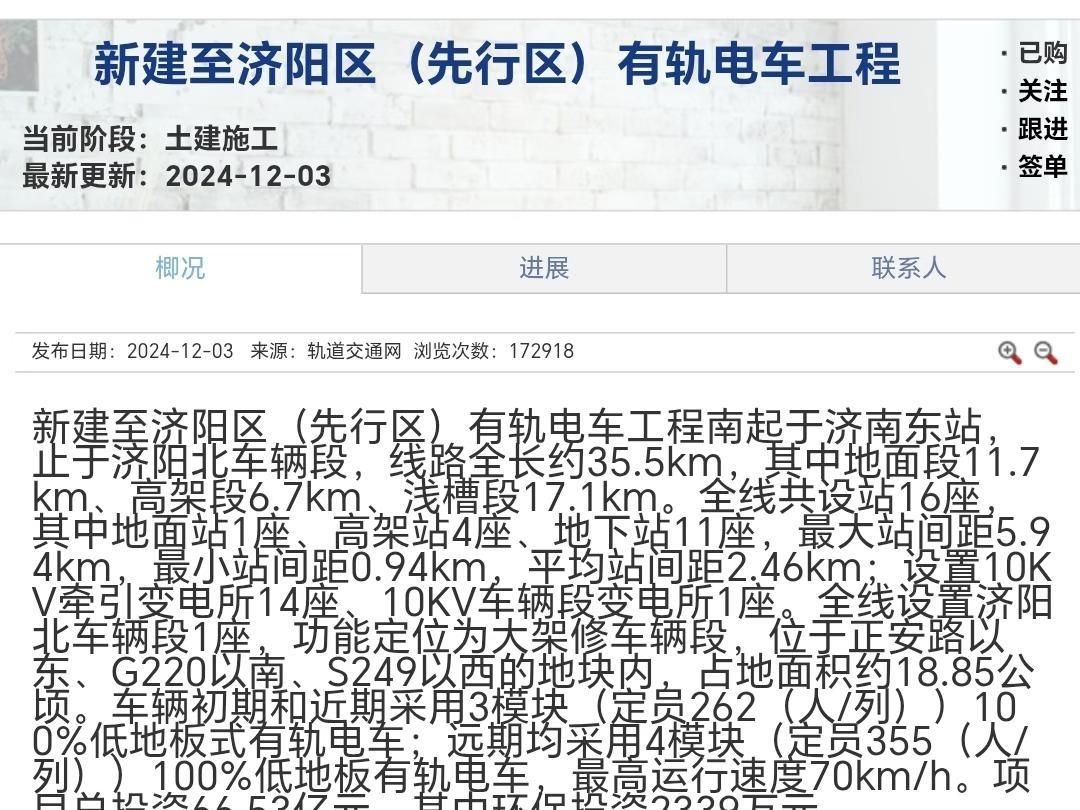 济南济阳线有轨电车造价66.53亿元 线路全长约35.5km, 每公里平均1.85亿元 其中地面段11.7 km、 高架段6.7km、 浅槽段17.1km。 全线共设站16座, 其中地面站1座、 高架站4座、 地下站11座, 最大站间距5.94km, 最小站间距0.94km, 平均站间距2.46km 车辆初期和近期采用3模块(定员262人/列).10 0%低地板式有轨电车; 远期均采用4模块,(定员355(人/ 列)100%低地板有轨电车, 最高运行速度70km/h。
