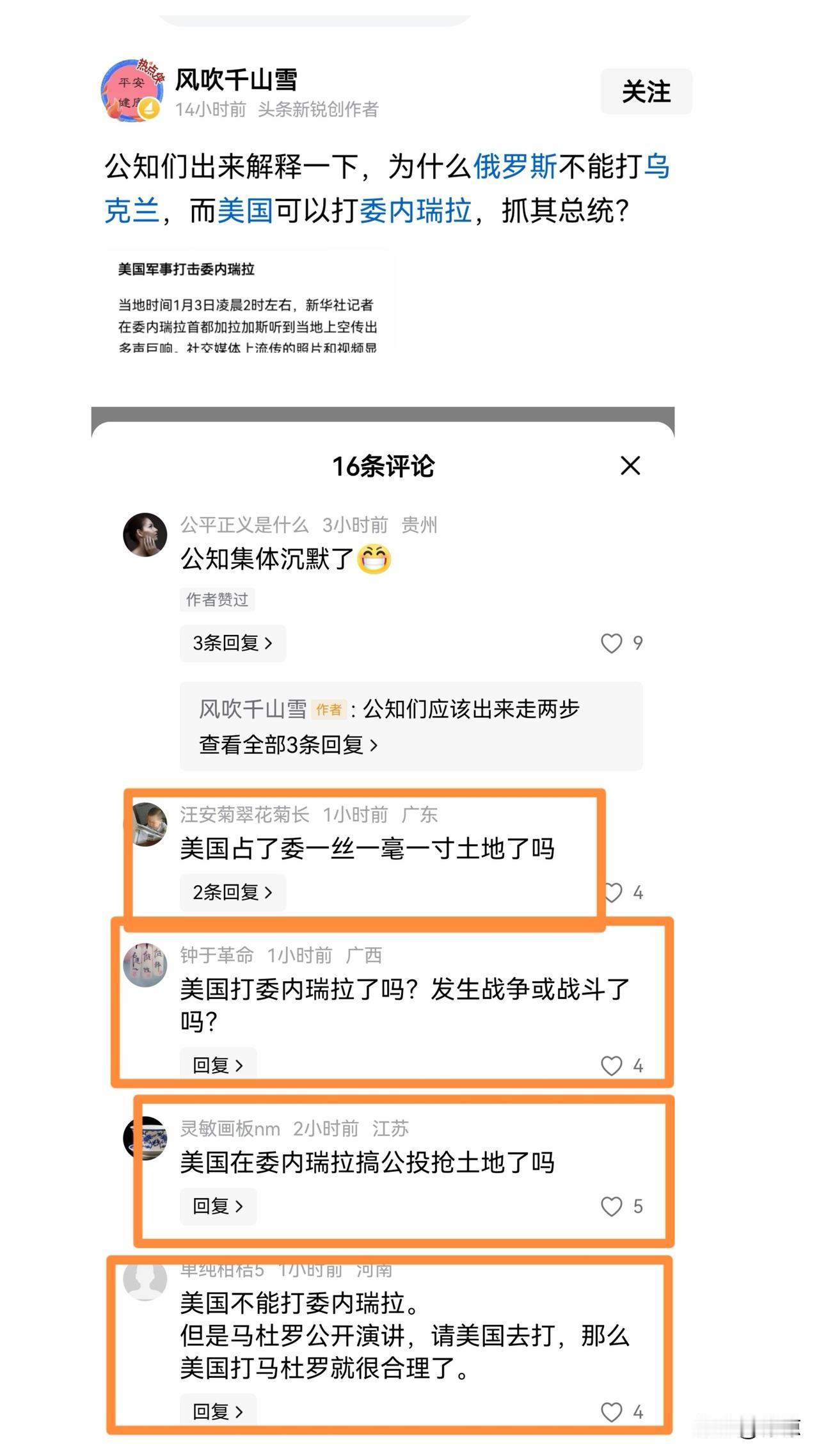 这个世界终于颠到了一个新的高度。 美国可以打委内瑞拉,抓其总统? 来自强盗舔狗的回复是这样的: “美国占了委一丝一毫一寸土地了吗” “美国打委内瑞拉了吗?发生战争或战斗了 吗?” “美国在委内瑞拉搞公投抢土地了吗” “美国不能打委内瑞拉。 但是马杜罗公开演讲,请美国去打,那么 美国打马杜罗就很合理了。” △
