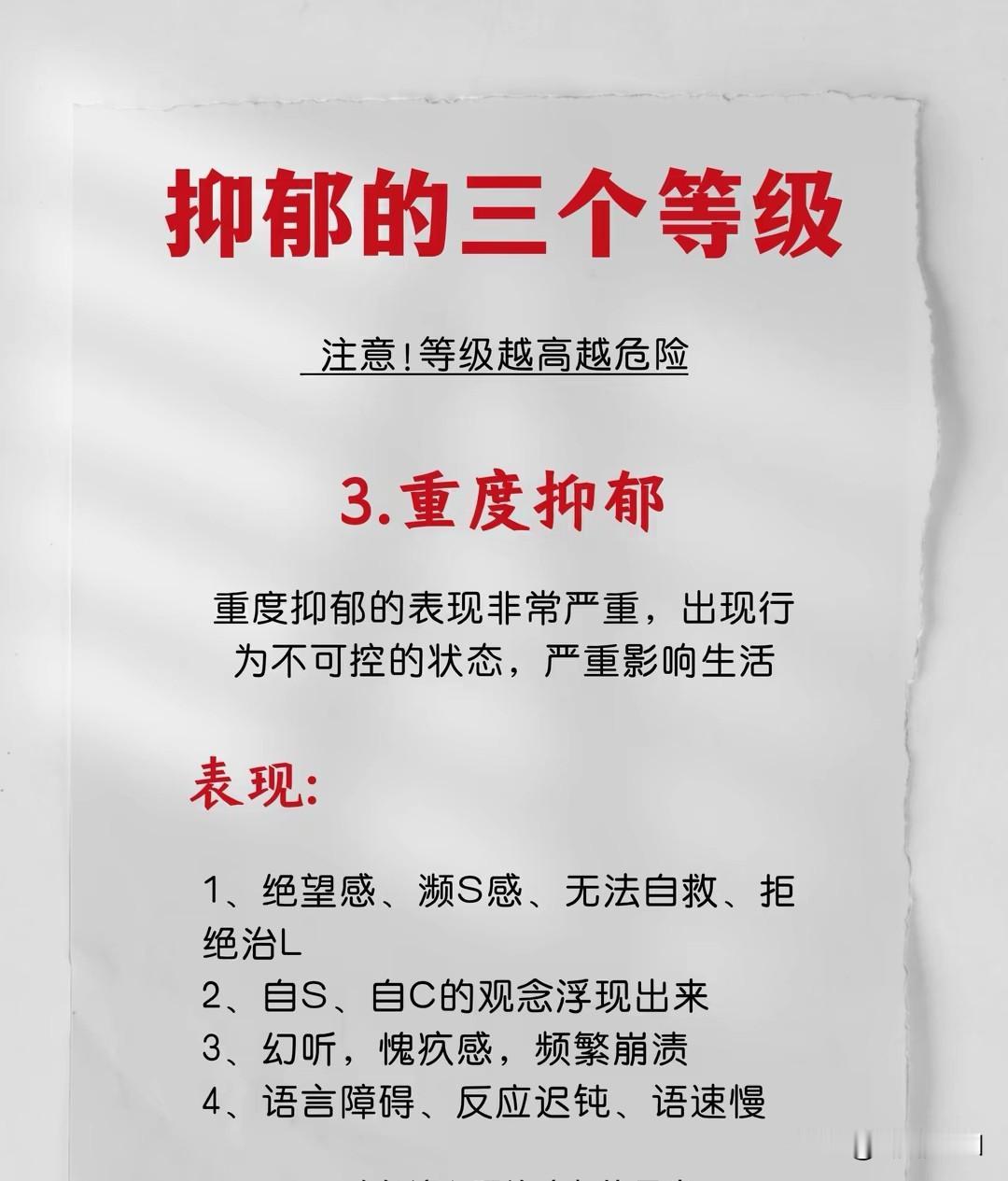 家人们,真的要警惕抑郁的信号!原来抑郁分三个等级,越往上越危险,尤其是重度抑郁,真的太吓人了😭 重度抑郁的人会陷入完全失控的状态,生活直接被拖垮。他们会有强烈的绝望感,甚至觉得自己快不行了,既没法自救,还会拒绝治疗;脑子里还会不停冒出自伤、自杀的念头,太让人心疼了。 更让人揪心的是,他们还会幻听、被愧疚感困住,情绪动不动就崩溃,就连说话都变得不利索,反应慢、语速也慢,像被按下了慢放键。 如果身边有人出现这些情况,千万别不当回事,也别让他们独自扛着!多给点关心,赶紧劝他们去看医生,哪怕只是一句安慰,都可能成为他们的救命稻草❤️