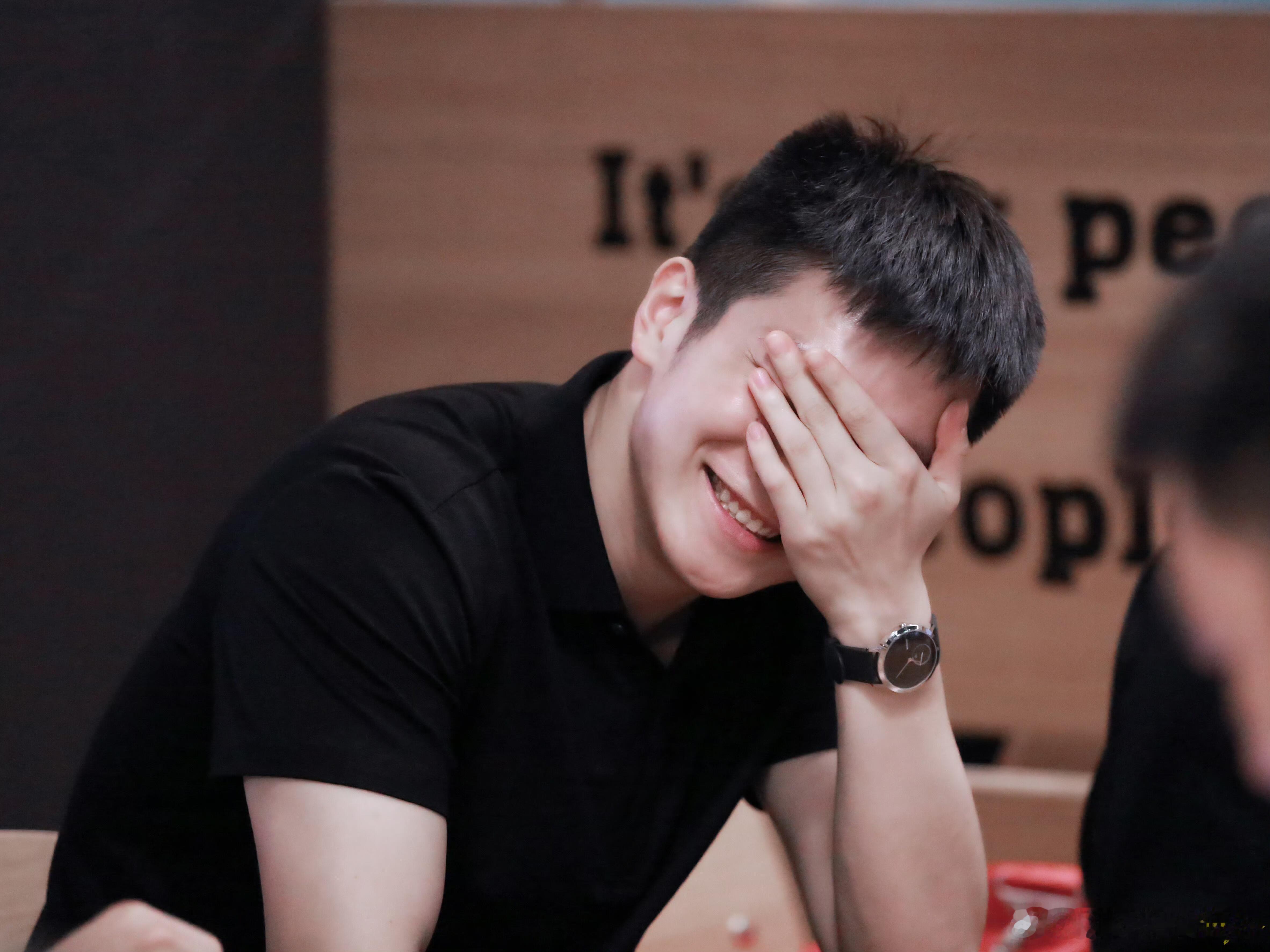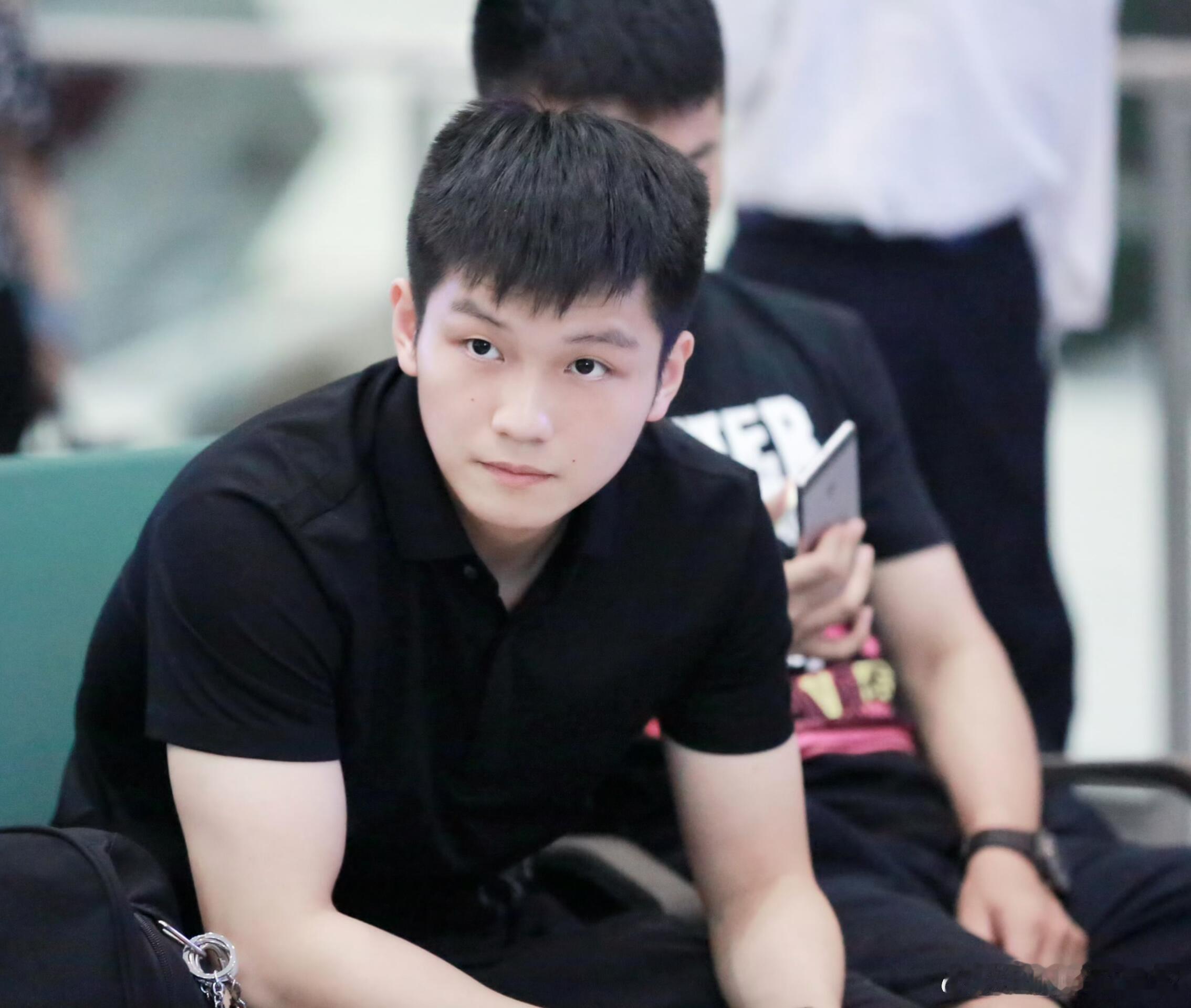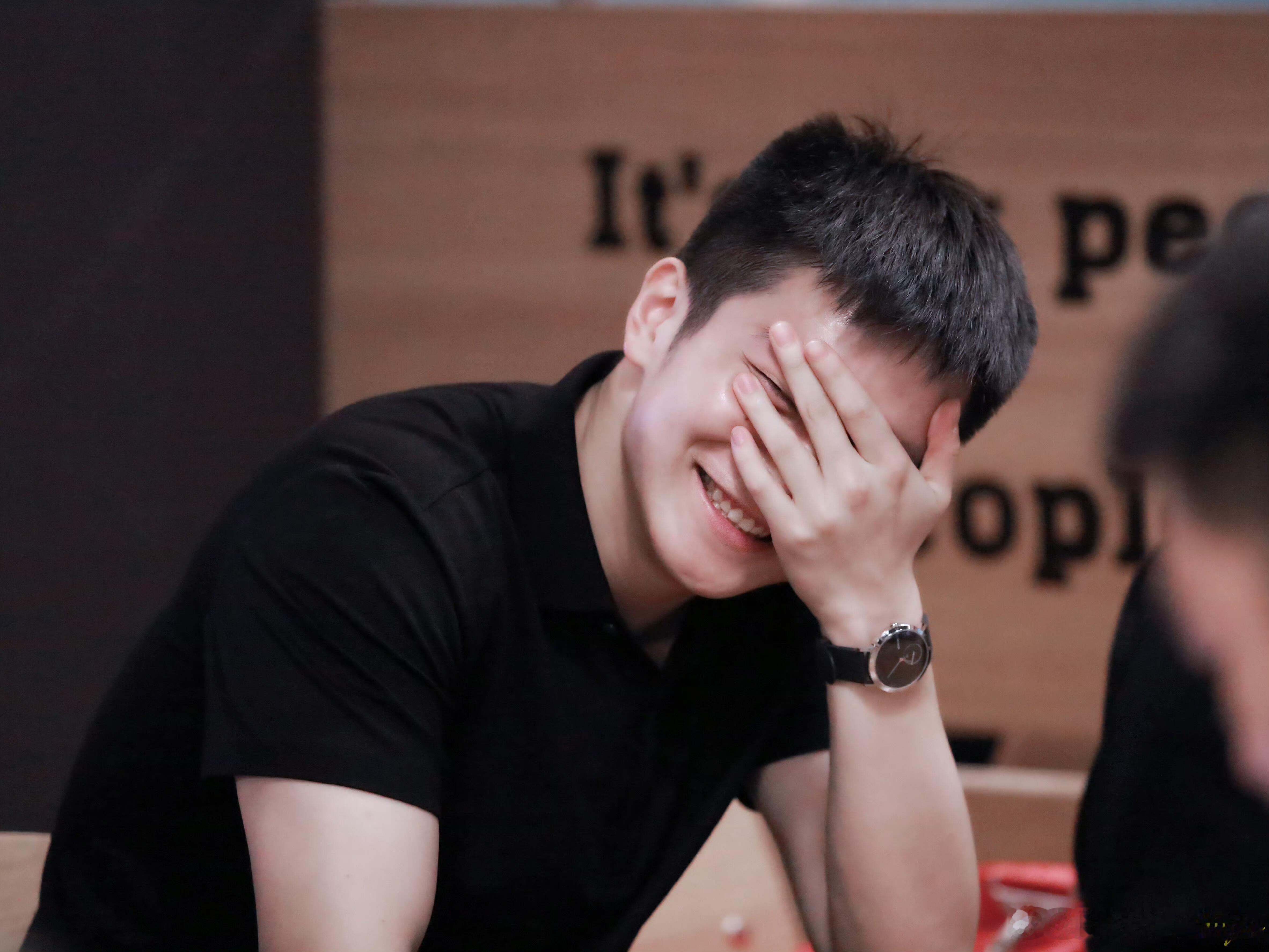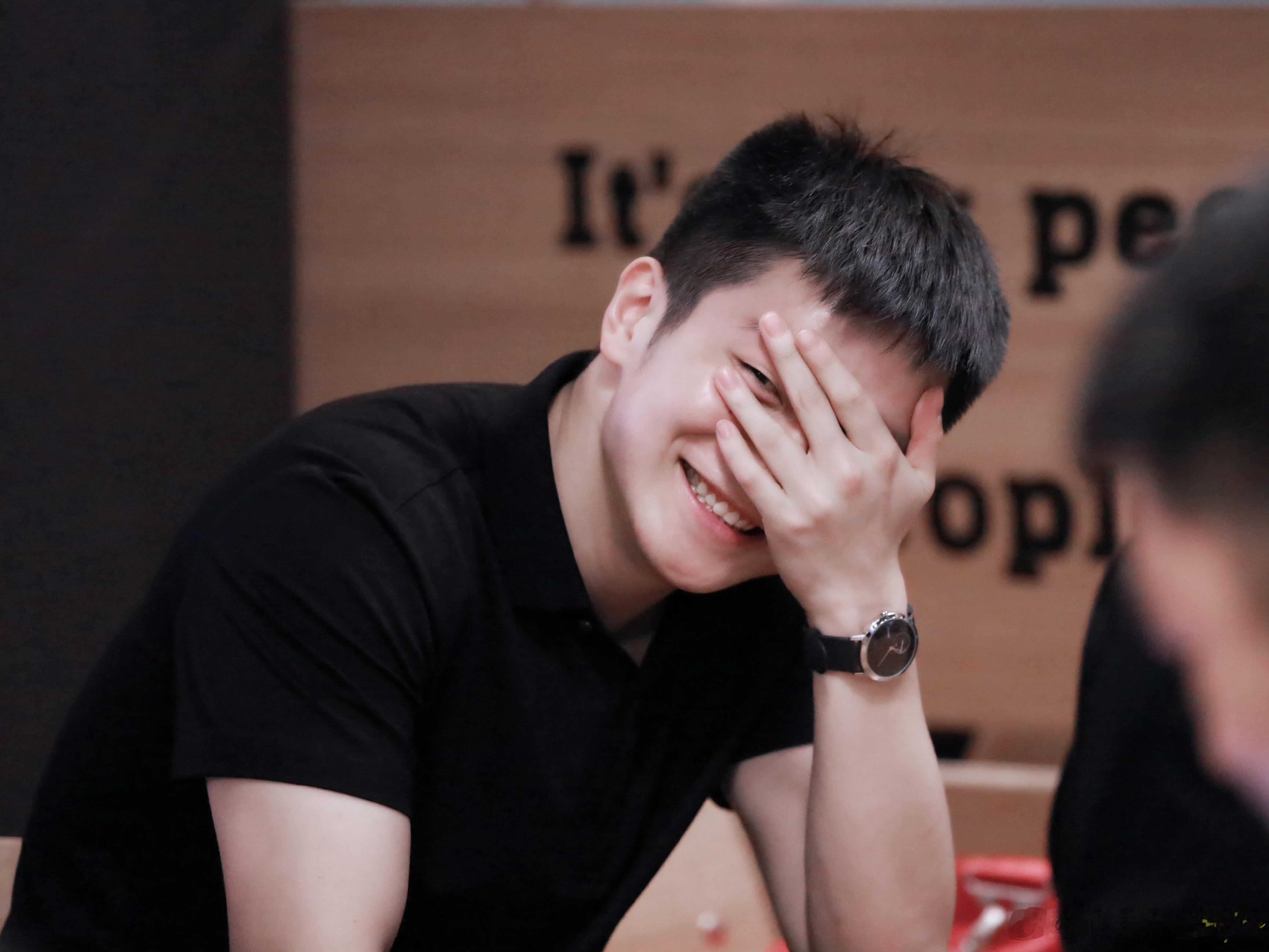 樊振东小卷毛造型超级可爱。 猜人:躲在东东后面这位是谁?