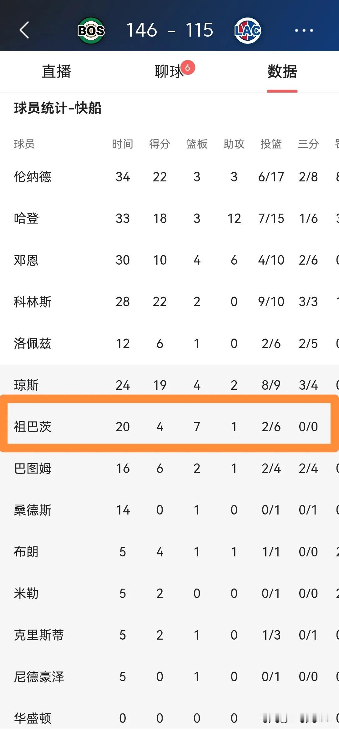 我忍不住要怒喷快船中锋祖巴茨!在今天快船主场以115:146惨败于凯尔特人的比赛中,伤愈复出的祖巴茨替补出战20分钟,投篮6中2非常低效的得到4分,他的场上正负值为-13。 虽然祖巴茨不是快船惨败的最主要原因,但是他的复出绝对影响了球队刚刚形成的化学反应,祖巴茨的伤势好的太快了。