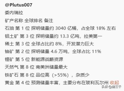 委内瑞拉匹夫无罪、怀璧其罪! 委内瑞拉是个巨大的资源宝库呀, 石油储量排名全球第一, 黄金、铝、稀土、铝矿、锂、铀均排进前5! 如果说南美作为地球第二颗肾, 那么委内瑞拉毫无疑问是肾动脉。 东大在整个拉美投资几千亿美刀呀, 白宫一招杀鸡儆猴, 又会让投资回报变得缥缈虚无。 这个阶段可能不得不学习老美做法: 海外基地保障海外利益。 白宫的算盘打的确实好, 整个南美就是一座超级巨大的资源宝库, 既要掌控资源还要掌控运输航道, 与此同时还打算占领加拿大在内庞大领土。 帝国愿景宏伟庞大呀…