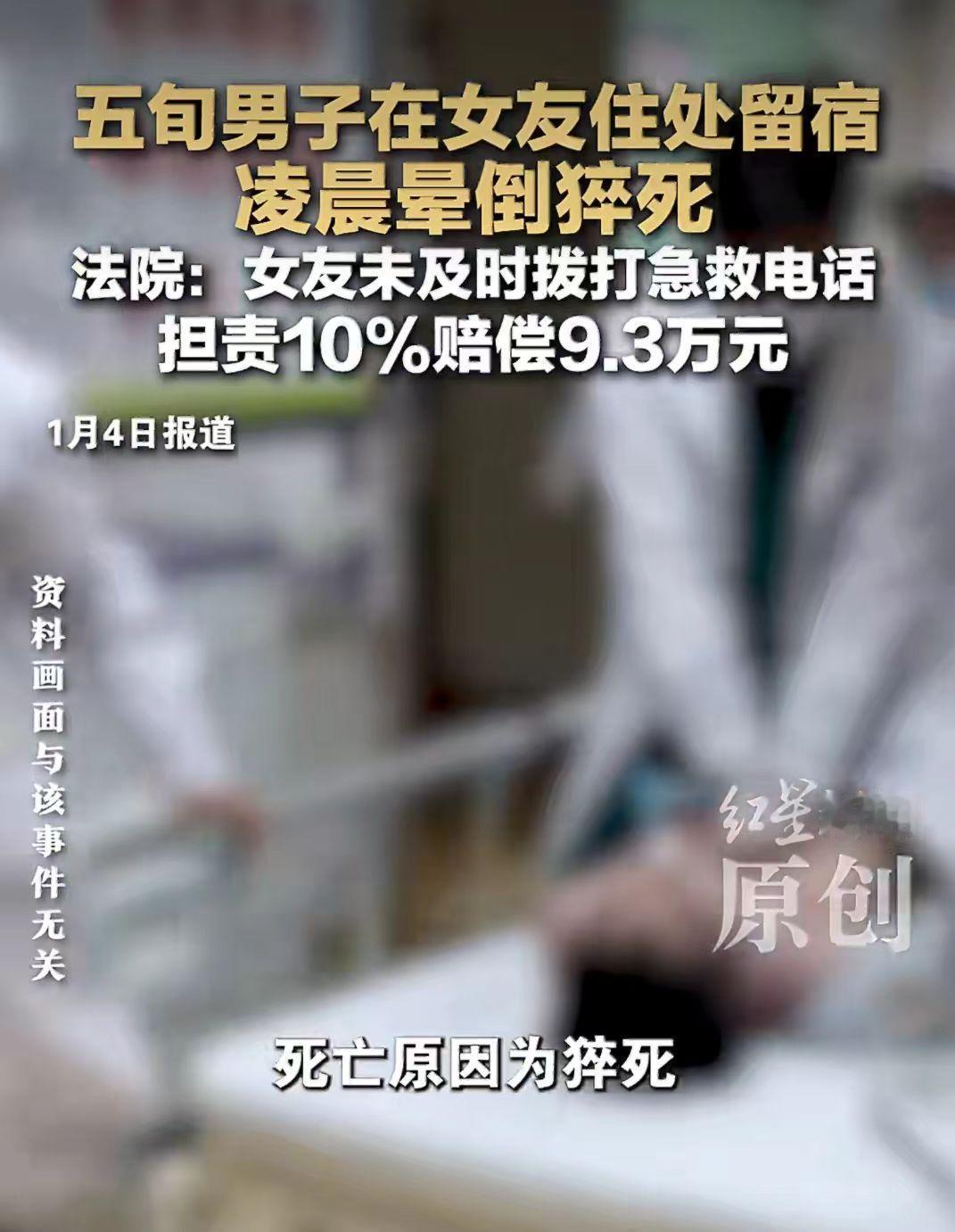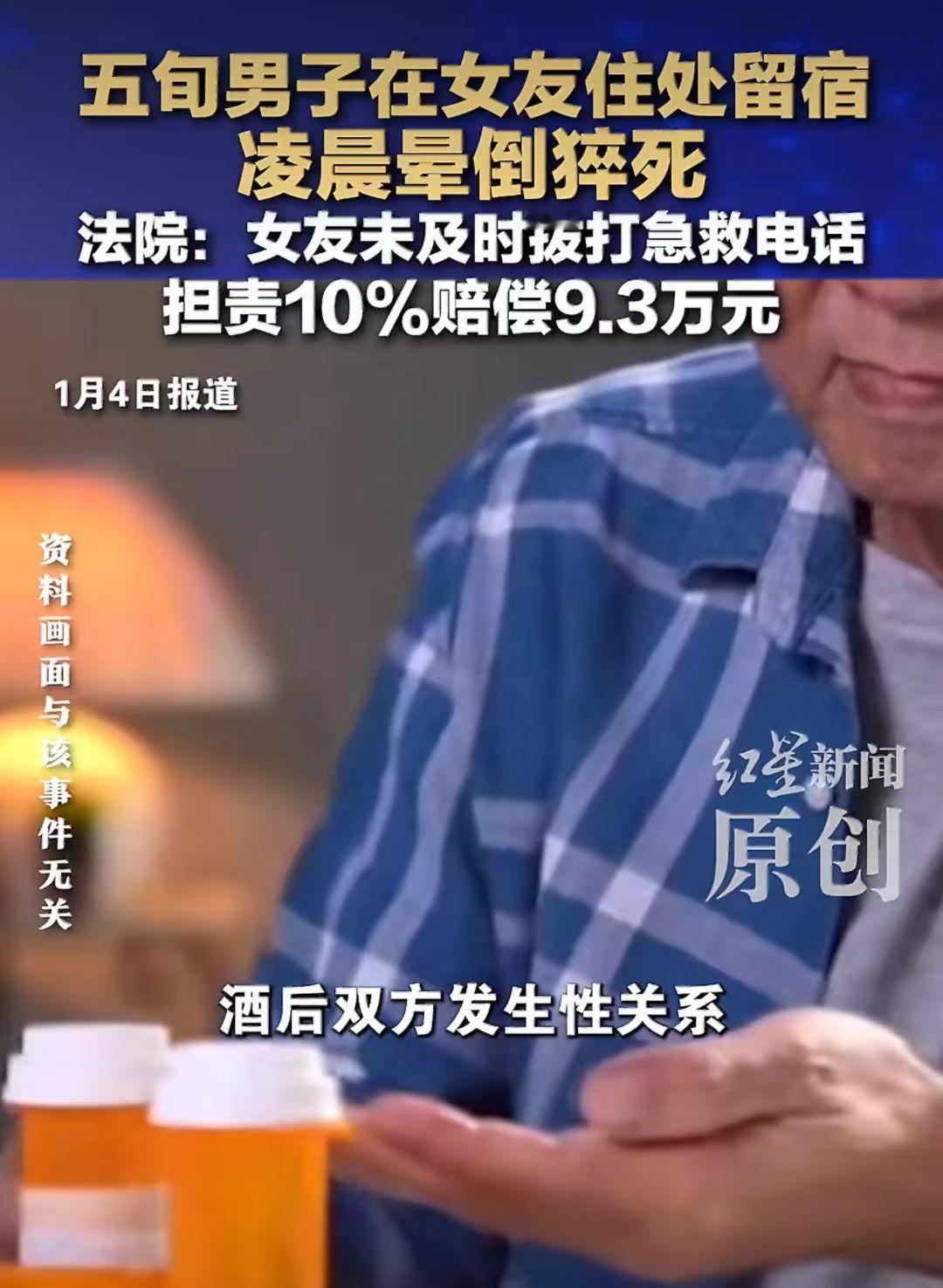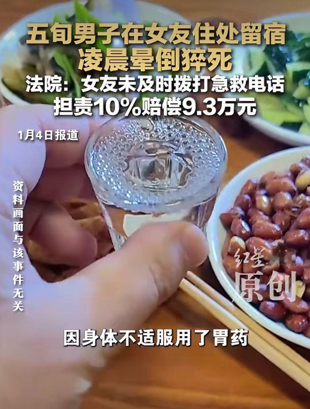 50多岁的谢先生在女朋友家留宿,一高兴就和女友喝了酒。 半夜谢先生猝死,谢先生亲人要女朋友巩女士赔偿18万。 谢先生和巩女士是男女朋友,巩女士觉得男朋友想留宿也就同意了。 两人高兴就喝了点酒,谢先生虽然50多岁了,但是不服老啊!在酒精的作用下,和女朋友发生关系了。 谢先生总觉得不舒服,但是也没多想,就自己找了点胃药吃。 半夜1点左右,巩女士发现谢先生昏倒在洗手间,就急忙找邻居帮忙把人抬到床上躺着,然后就打车去找男朋友谢先生的朋友来帮忙。 人都昏迷了,为什么不是第一时间打急救电话呢? 谢先生是1点左右昏迷的,急救电话是3点18分打的。 这中间隔的时间也太长了点。 谢先生家人觉得女朋友做的事情太不对了,明知道男朋友患有高血压、中风等病,还让他喝酒,这不是故意的吗? 谢先生亲人就把巩女士给告了,要求赔偿18.7万元。 这合理吗?男女朋友在一起喝酒是自愿的,发生关系也是自愿的,谢先生也是个成年人,自己能不能喝酒会不知道吗? 谢先生在2024年2月份就查出患有中风病、缺血性脑血管病、高血压2级。 这是明知道身体不能喝酒还是喝了,这个能怪女朋友吗? 法院最终审理认为女朋友巩女士虽然救了谢先生,但是救助不当,应赔偿9.3万元。 巩女士是做梦也没想到老了,谈个男朋友竟然让自己人财两空。 你觉得女朋友有责任吗?应该给赔偿吗?