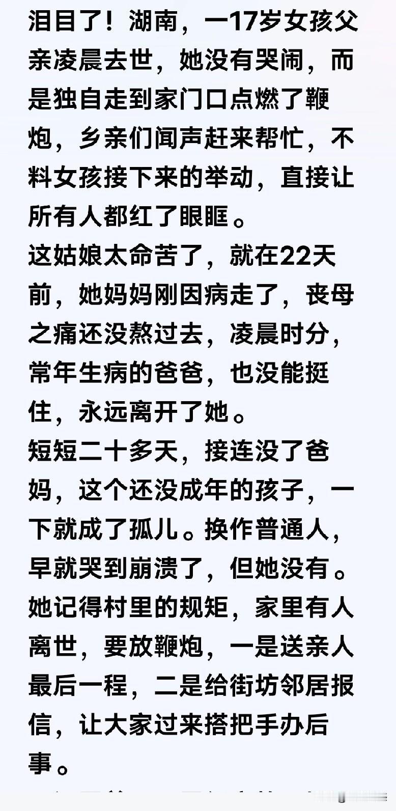 湖南这个17岁的女孩命运太悲苦了,在22天时时间内,父母先后离开了这个世界,这让这个可怜孩子可怎么过呀!但凡看到这个消息的人,心里都非常难受,这个孩子太孤单了,希望她能够挺过去,希望好心人能够帮帮她,这个孩子真是太不容易了!