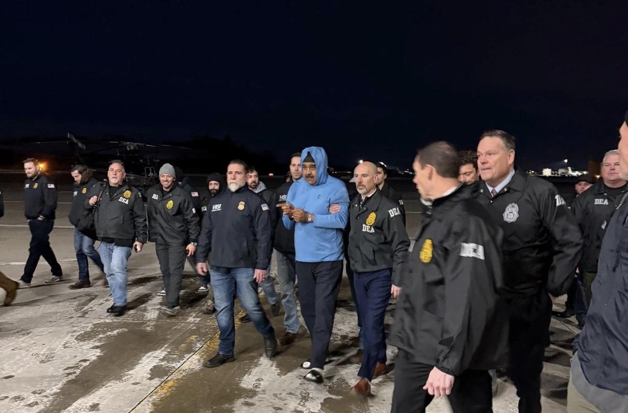 画风突变,英姿飒爽的马杜罗几个小时前还是一国之君,忽然就被特朗普发出站在军舰上邋遢照片。几个小时内,马杜罗变装两次。 马杜罗已经被戴上了眼罩和耳机,估计是语言沟通不顺畅,表情一改往日的凝重,一手拿着矿泉水,还被美军送了镯子。看灰白的衣服应该是试图反抗过,发抖的样子,估计是被突如其来的待遇给整懵圈了。 马杜罗在被押往美国的飞机上已经穿上了一身白衣服,看样子是睡衣,有人推测是被从床上拉起来时穿的衣服。很明显他是一边赶路一边面无表情的接受周围人的问询。 再次出现在公众视野时已经被换了衣服,脚穿拖鞋示人,应该还是被抓捕来不及换的拖鞋。上衣换成了蓝色,FBI通常促使嫌疑犯安静穿的颜色,衣服有防风帽子。坐下来时双手比着胜利的姿势,表情不再紧张,不知道再向外界传递什么信号。