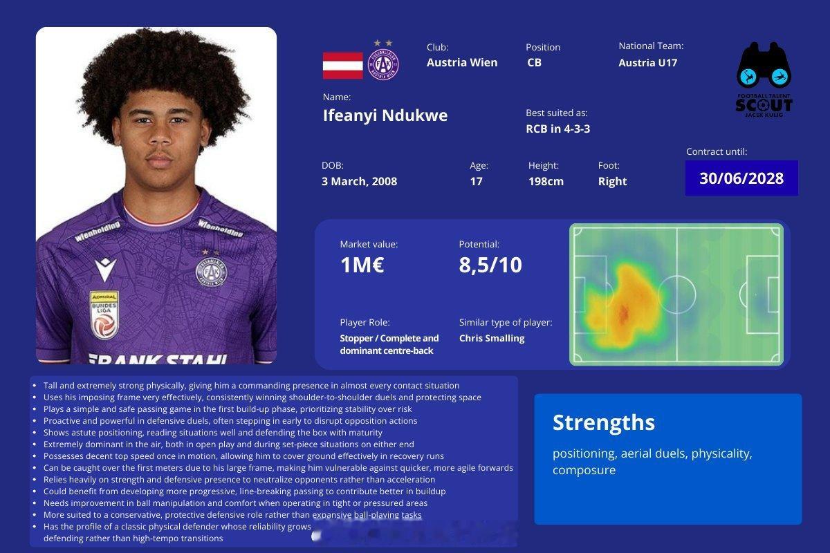 【小巨人】利物浦从奥地利维也纳签下的17岁中卫,恩杜克韦,预计将在2026年夏窗(年满18岁)之后正式参军。这名小将,2025年代表奥地利出战U17世青赛,报名资料显示他的身高是1米98。。。。未来几乎肯定可以成为身高超过2米的巨人中卫。