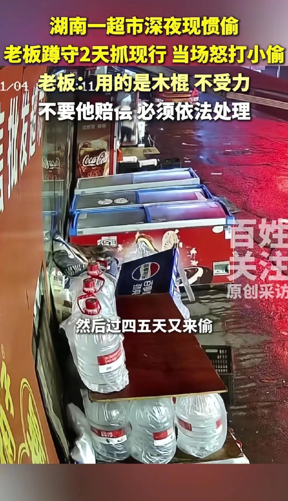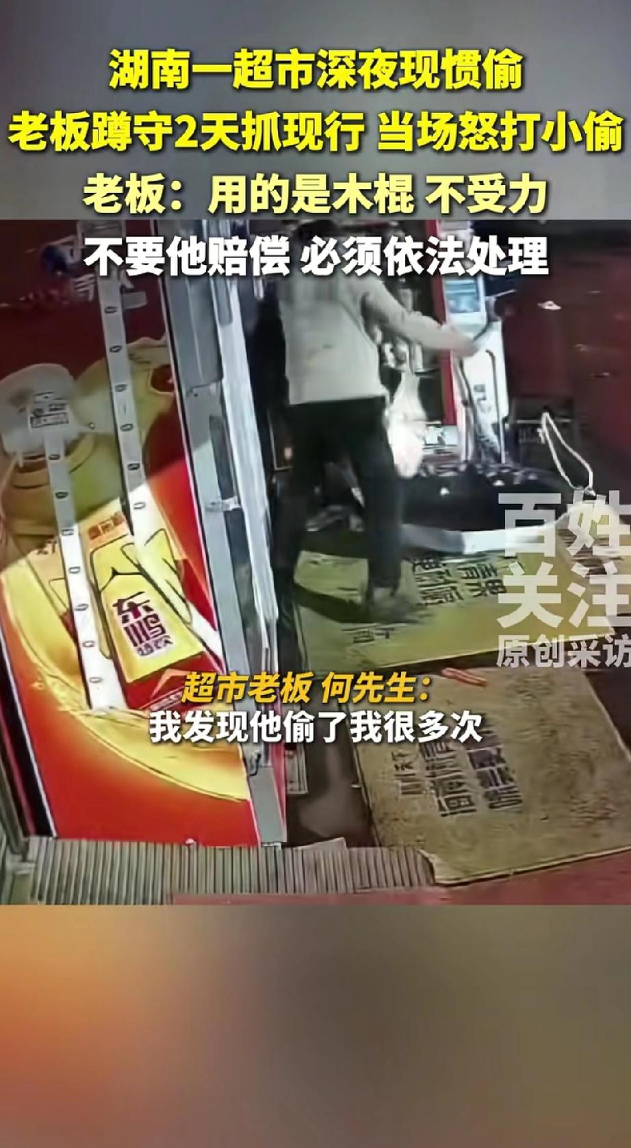 该不该打?湖南湘潭,超市老板发现,放在店门口的饮料经常丢失,一次两次就算了,结果对方连着偷了7次,老板忍无可忍,在门口蹲了两晚,终于抓到现行,拿着木棍上前怒打小偷并报了警,但该不该打,却引起了不少讨论 超市老板何先生调监控发现,这男子已经偷了好多次了,隔几天就来一次,每次偷四五瓶饮料。 何先生气坏了,就专门蹲守了2天。在3时40分左右,那男子又来偷饮料,何先生赶紧冲出来,用一根小木棍打了小偷。之后民警来了,把小偷带回派出所调查。 何先生说,他用的是木棍,不受力,不是什么铁棍。而且他不要小偷赔钱,就要求依法处理,因为觉得上什么锁都防不住这种小人,小偷是直接用手掰开锁或者从冰箱缝里伸手拿东西。 有网友算了一笔账:每次偷四五瓶饮料,假设一瓶5元,十次就是二三百元。对于小超市来说,这可能是好几天的利润。 更让人气愤的是小偷的嚣张——明明有锁,他直接用手掰开;明明有监控,他依然肆无忌惮地作案。 小本生意不容易,这种惯偷太可恨了!”“四五天偷一次,这是把超市当自家冰箱了?” 事件引起如此多关注,是因为它触碰了大众的两个敏感点:一是对小本经营者的同情,二是对“惯犯”行为的深恶痛绝。 许多普通商户——他们每天起早贪黑,利润微薄,却要面对各种损耗和偷盗。当法律惩处不够及时有力时,他们的愤怒与无奈可想而知。 老板那句“上什么锁都是防君子不防小人”道出了多少商户的心声。防盗措施防得住普通人,却防不住处心积虑的惯犯。 值得欣慰的是,尽管情绪激动,老板最终选择了“依法处理”。这种克制,既维护了自身权益,也守住了法律底线。 一根小木棍的背后,是小生意人的长期忍耐被打破的瞬间。冰箱上那条缝隙,不仅暴露了防盗漏洞,也折射出小商户在面对惯偷时的无力感。 事件最值得思考的是:当防盗设施防不住惯犯,当监控只能记录却无法制止偷盗行为时,小本经营者该如何保护自己的劳动成果? 老板最终选择依法处理,给事件画上了一个理智的句号。这也提醒我们,在任何情况下,法治才是解决问题的根本途径。