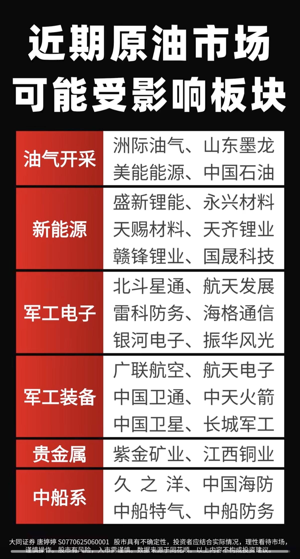 近期原油市场:可能受影响板块! 1.油气开采 2.新能源 3.军工电子 4.军工装备 5.贵金属 6.中船系