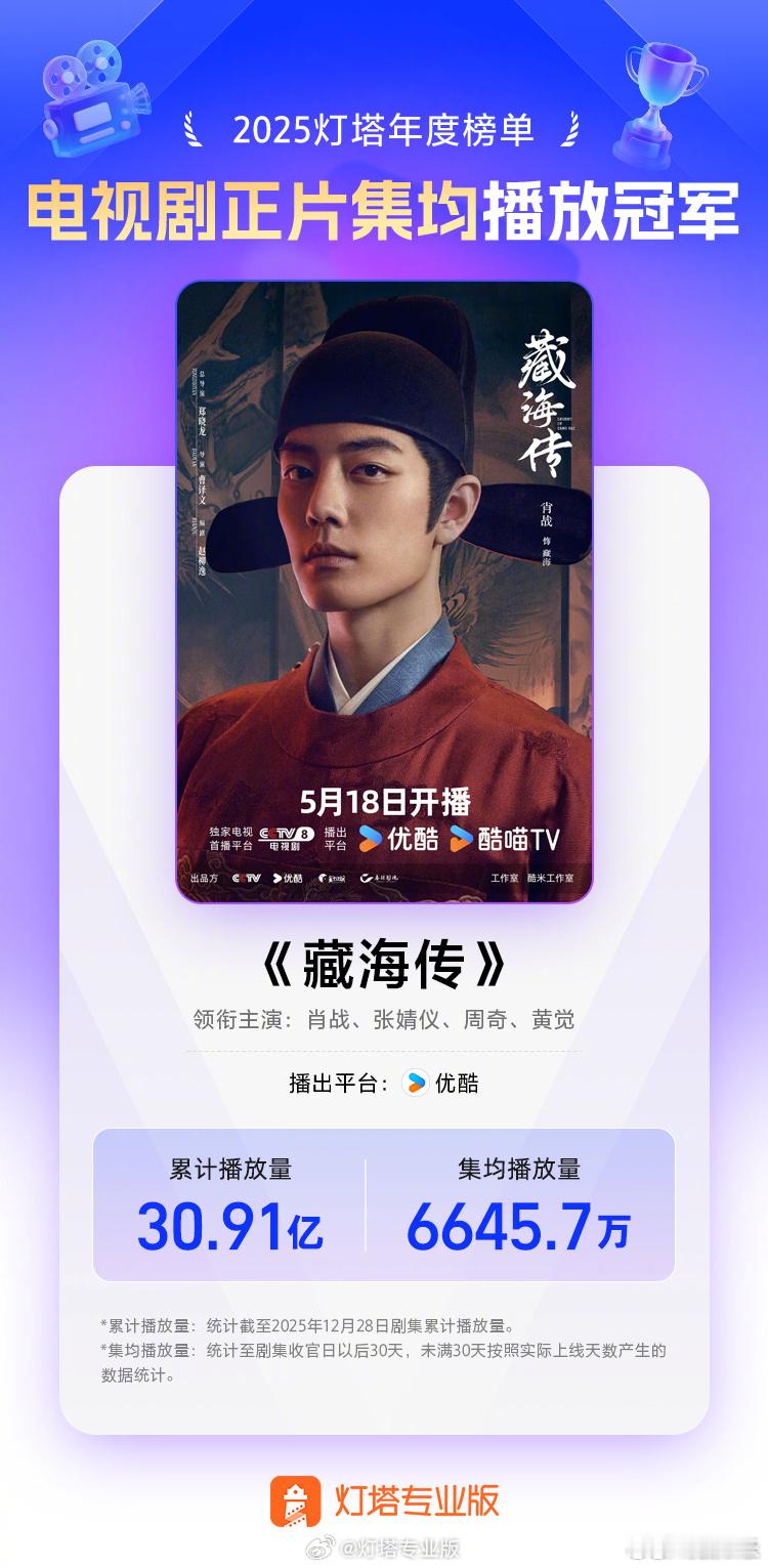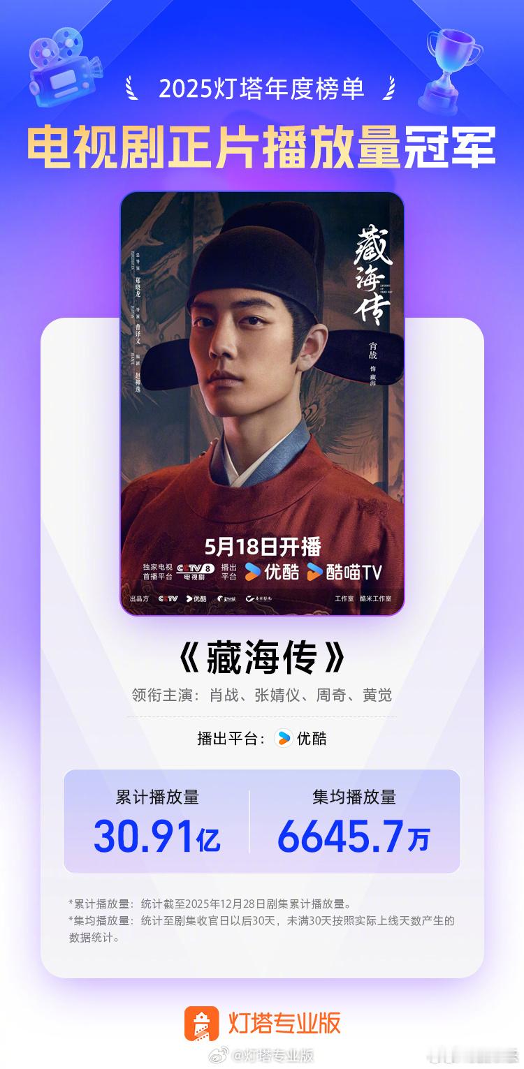 藏海传2025拿了30个冠军肖战藏海转2025拿了30个冠军 据网络平台数据:等主演的电视剧《藏海传》获得2025全网剧集正片播放冠军、2025电视剧正片播放冠军、2025电视剧正片集均播放冠军、2025古装剧播放冠军、2025悬疑剧播放冠军、2025优酷播放冠军、24次单日播放量冠军。太牛啦肖战