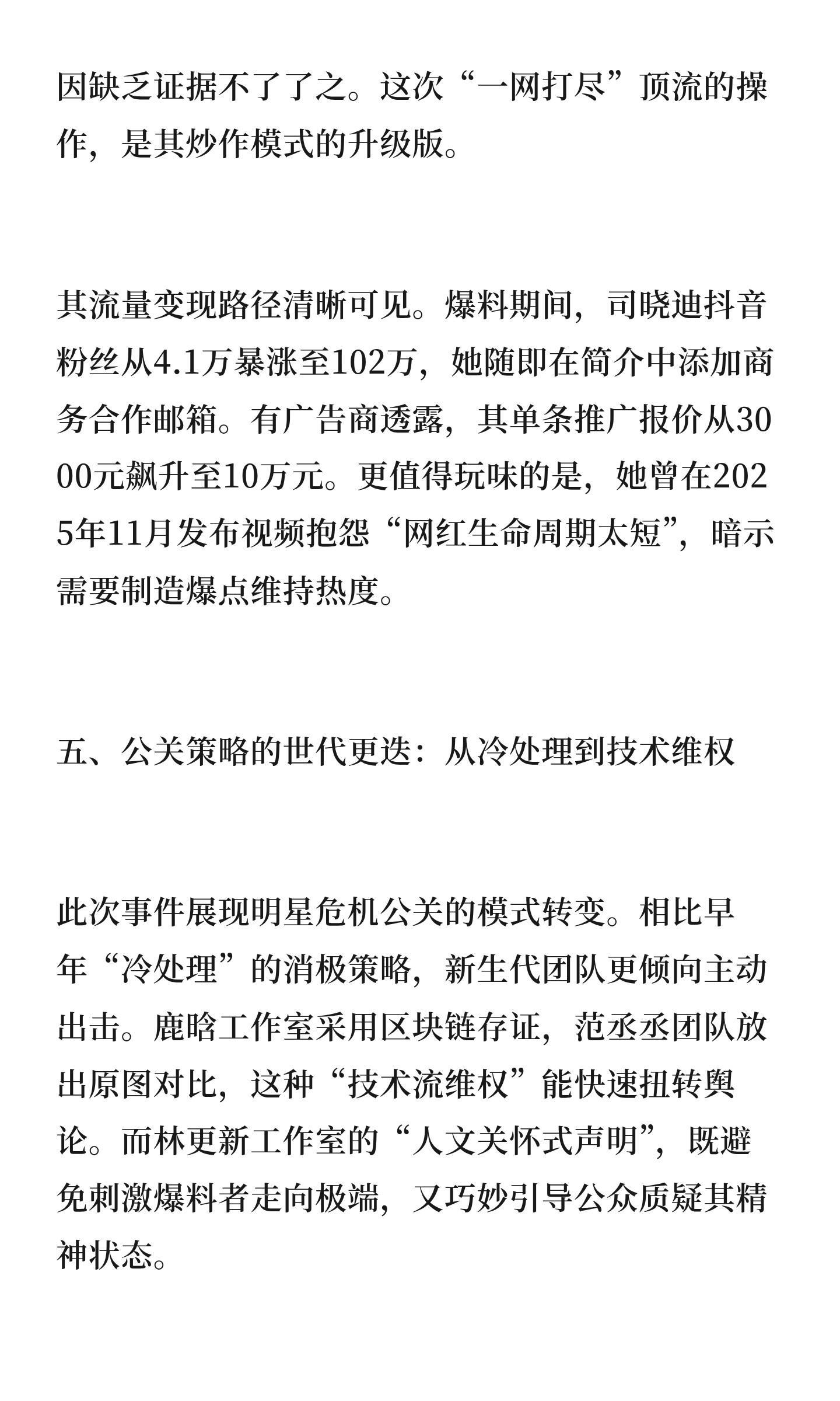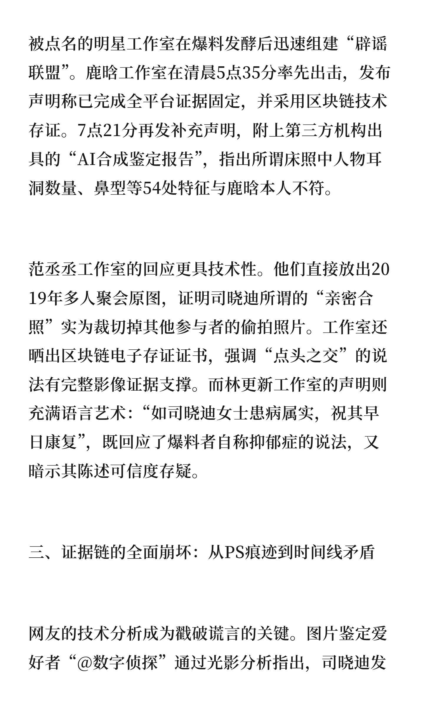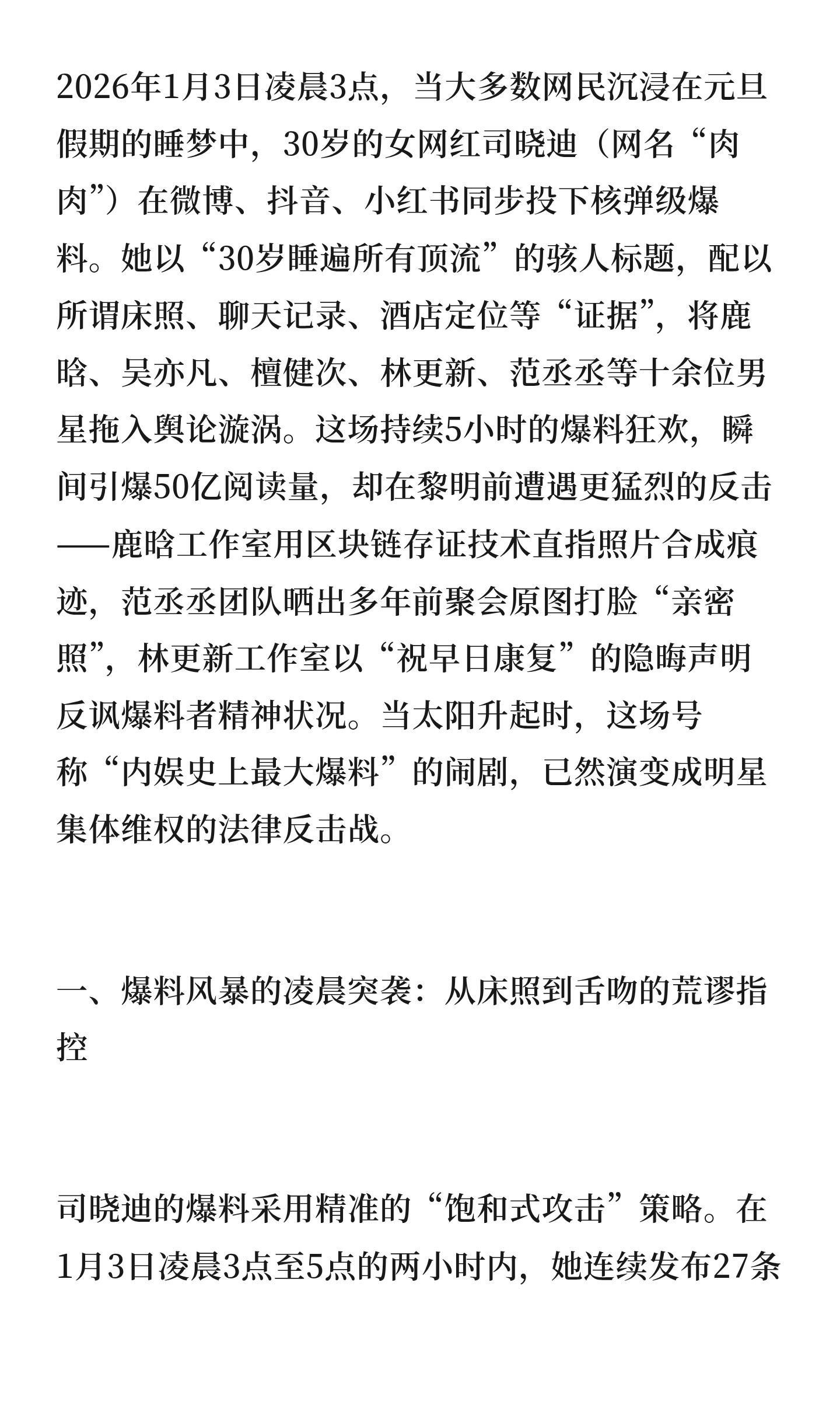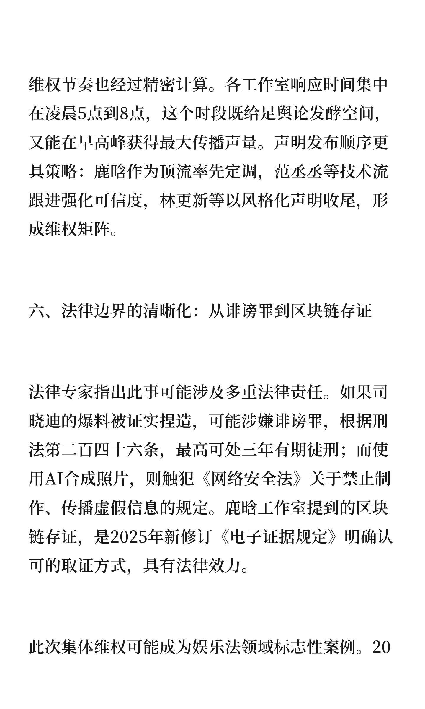 女网红司晓迪爆料鹿晗等顶流“睡遍所有”,引发舆论风暴。明星团队迅速反击,鹿晗工作室采用区块链存证,范丞丞晒出聚会原图,林更新以隐晦声明回应。事件揭示明星维权新趋势,技术手段成关键。