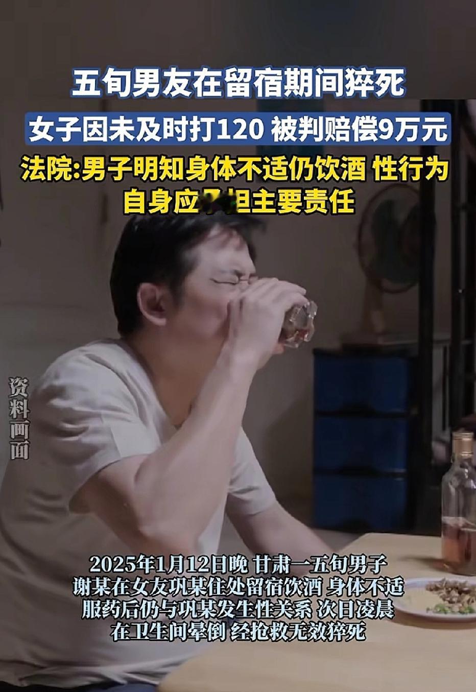 甘肃甘谷,五旬男子留宿女友家,两人晚上饮酒后,男子身体不适,他就吃了胃药,还和女友发生了关系。凌晨男子突发疾病,在卫生间晕倒,女友慌了,赶紧去叫邻居帮忙抬床上。再出门打车叫同事帮忙,却没有及时打120,男子经抢救无效,不幸去世,家属将女友告上法庭,索赔18万元。法院这样判。 据悉,50多岁的谢某与女友巩某相恋半年有余。 2025年1月5日,谢某看望女友,当晚就在她家过夜。 晚餐时,两人饮用了一瓶白酒,酒过三巡,谢某因胃部不适,自行服用了随身携带的胃药。 此时两人,却没意识到喝酒了就不能吃药。 尤其是对于本就患有缺血性脑血管病、高血压等基础饮酒的谢某。 随后,两人发生亲密关系。 谢某的举动为后续悲剧埋下了伏笔。 事后谢某称身体疲惫,便卧床不起,巩某也没在意。 凌晨,谢某上厕所时,却晕倒在厕所中。 巩某发现后,又慌又乱,她一个人搬动不了谢某,于是跑去叫邻居将谢某抬到床上。 后巩某又赶紧出门打车去谢某的公司,寻找谢某的同事帮忙。 在车上,巩某才意识到要打120急救。 从发现晕倒到拨打急救电话,近一个小时的时间流逝,谢某还是错过了抢救黄金时段,不幸去世。 谢某的家属悲痛万分,他们将巩某告上法庭,索赔18万余元。 法庭之上,双方各执一词。谢某家属悲痛控诉,认为巩某作为事发时唯一在场的亲密伴侣,负有不可推卸的救助义务,就是她错误的救助方式,导致谢某死亡的重要原因。 巩某则泣不成声,辩称自己当时方寸大乱,完全慌了神,并非故意延误救治时间。 《民法典》第1170条规定,侵害他人造成人身损害的,应当赔偿医疗费、护理费、交通费、营养费、住院伙食补助费等为治疗和康复支出的合理费用,以及因误工减少的收入。造成死亡的,还应当赔偿丧葬费和死亡赔偿金。 法院审理后认为,谢某作为完全民事行为能力人,明知自身患有高血压、冠心病等基础疾病,仍过量饮酒,且在服药后进行剧烈运动,对自身死亡存在主要过错。 而巩某在发现谢某晕倒后,未及时履行合理救助义务,未第一时间拨打急救电话,客观上延误了救治时机,存在一定过错,应承担次要责任。 法院判定巩某承担10%的责任,共计9.3万元。 巩某不服,提起上诉。 二审驳回上诉,维持原判。 说到底,这场悲剧本可以避免。 如果谢某能敬畏自身的基础疾病,不抱侥幸心理饮酒、逞强,如果巩某能在突发状况下保持冷静,第一时间求助专业医疗力量,一切或许会是另一种结局。 对此,你怎么看?