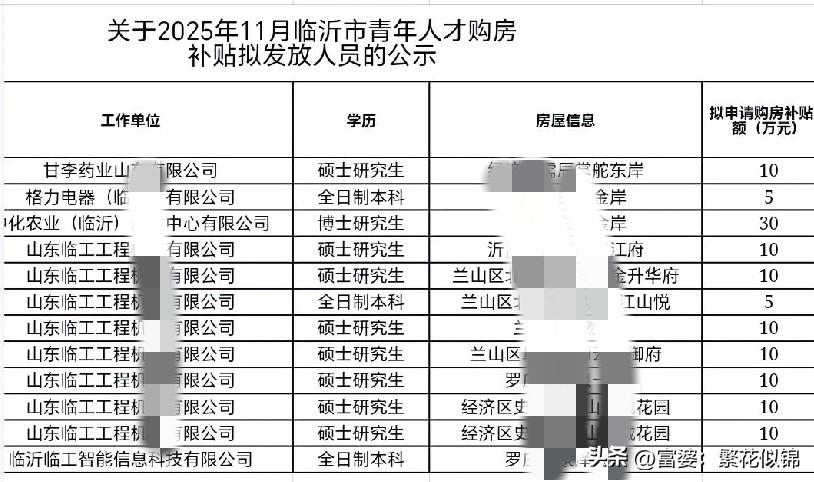 山东一地博士研究生购房,政府补贴30万 近日,临沂沂河新区政府网站公示了2025年11月临沂市青年人才购房补贴拟发放人员。 这些青年人才都是在临沂沂河新区就业的,其中一位博士研究生在沂河新区某企业就业并在临沂购房,政府直接补贴30万,硕士研究生补贴10万,全日制本科补贴5万,买房根本不用家里帮衬了,自己就搞定了。 现在来临沂的青年人才真的太幸福了,再也不用为买房贷款而有生活压力了。临沂刚需购房 临沂购房优惠