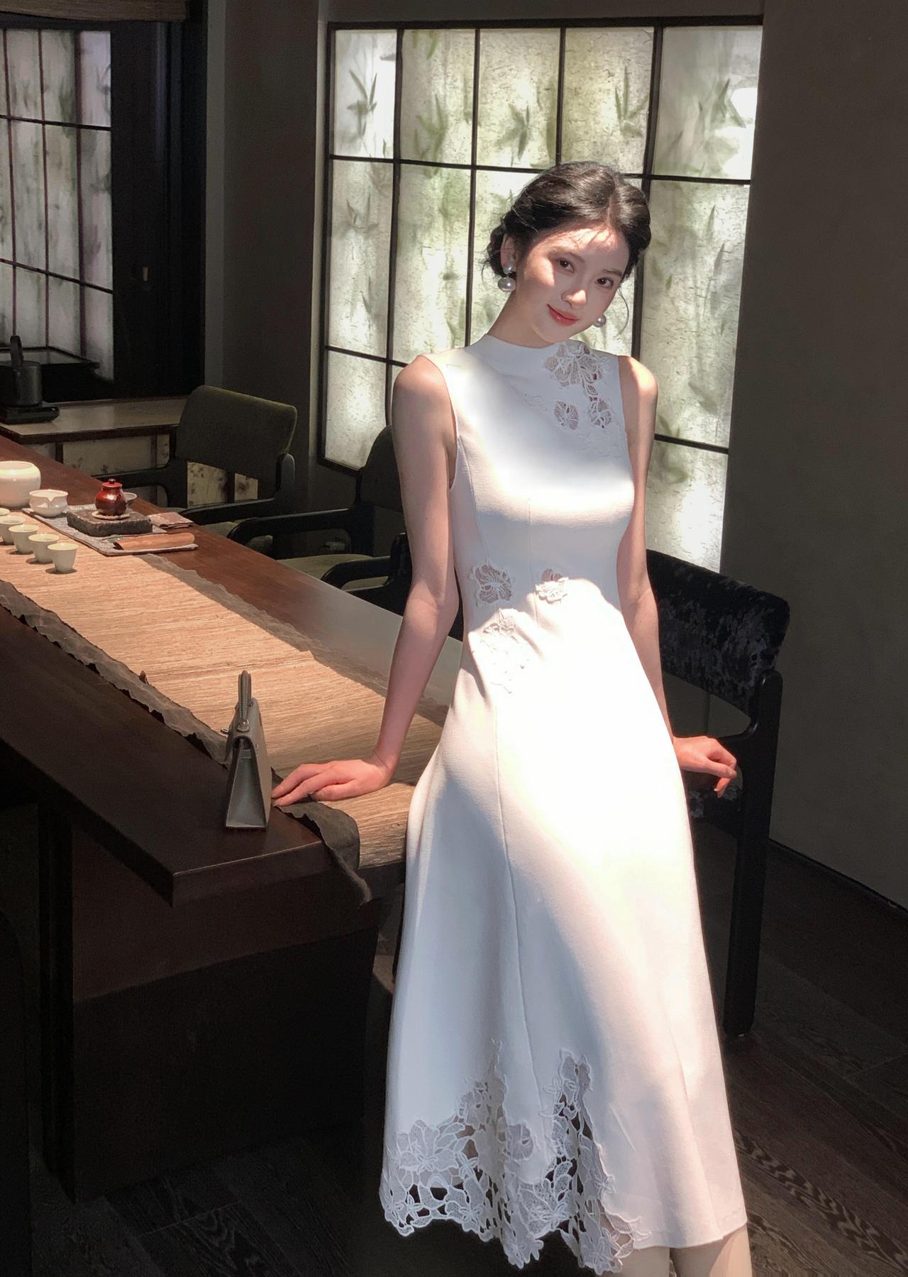黑色连衣裙,戴着眼镜,看起来很优雅。吊带气质黑裙