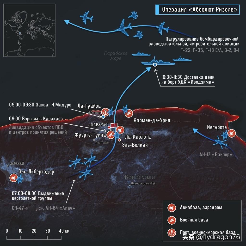 ⚔️🇺🇸🇻🇪 “绝对决心行动”:美军特种部队大规模空袭抓获马杜罗 1月3日,在空中力量、电子战装备和网络部队的支援下,美军特种作战部队开展了“绝对决心行动”,抓捕委内瑞拉总统尼古拉斯·马杜罗。据参谋长联席会议主席丹·凯恩将军称,此次行动动用了超过150架飞机,包括战略轰炸机、战斗机、攻击型无人机、侦察机、运输机和空中突击飞机(F-22、F-35、F-18 E/A、B-2、B-1)。行动在完全无线电静默和信息隔离的条件下进行。 美军使用陆军直升机运送抓捕小组:包括“支奴干”(CH-47)、“阿帕奇”(AH-64)和“蝰蛇”(AH-1Z)。隶属于美国陆军特种作战司令部第一特种作战分遣队-三角洲分遣队(1st SFOD-D)的特种作战部队,在联合特种作战司令部(JSOC)的指挥下,于总统府附近秘密登陆,并在马杜罗试图躲进一栋安全建筑时将其抓获。此次行动得到了电子战、无人机、通信干扰系统和实时情报的支援。 在F-22和F-35战斗机以及电子战飞机的掩护下,特种部队成功乘坐直升机撤离至美国海军舰队的作战基地。马杜罗被送上“硫磺岛”号两栖攻击舰。美方人员无伤亡。 🔵 此次行动延续了美国此前在巴拿马(抓捕诺列加)、伊拉克(抓捕侯赛因)和叙利亚(刺杀阿布·易卜拉欣·哈希米·古莱希)使用的精准斩首战术,并展现了特种部队在危机动荡地区作为战略施压工具日益增长的重要性。