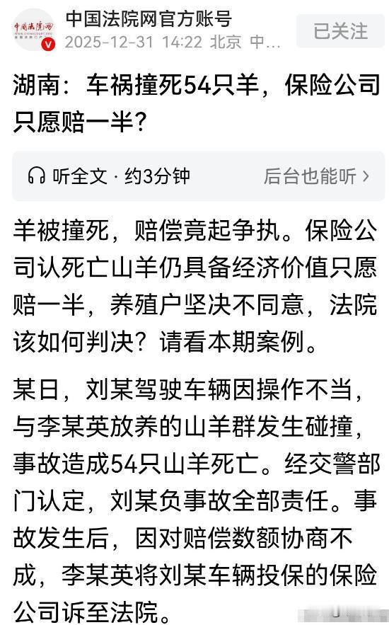 湖南湘潭,一辆轿车突然失控冲进路边羊群,连撞带压致54只山羊当场死亡,司机刘某被认定全责,保险公司定损山羊价值9.9万多元。可保险公司觉得死羊能卖钱,只愿赔一半,村民要求拉走处理并全赔,协商无果后告上法庭,法院判决保险公司全额赔偿99290元,最终,经过二审,维持了原判。 (来源:中国法院网官方账号) 2023年9月,村民李英站在自家羊圈旁,看着满地的死羊不知所措,这些羊是她全家一年的指望,如今54只全没了,而这场悲剧的起因,竟是一辆失控的轿车。 事发当天下午三点,刘某驾驶轿车沿乡道行驶。因长时间驾驶疲劳,他思想突然走神,车辆猛地偏离车道,径直冲向路边羊圈。 羊群受惊四处逃窜,但根本来不及躲避。轿车像脱缰野马,连撞带压,54只山羊当场死亡,现场惨不忍睹。 李英闻讯赶来时,看到的是满地狼藉,这些羊她养了三年,更让她崩溃的是,丈夫去年查出重病,治疗花光积蓄,这些羊本是全家翻身的希望。 经交警勘查,认定刘某负全部责任。 刘某吓得不停道歉,他告诉李英,车辆买了全险,保险公司会赔偿。 李英稍稍安心,开始清点损失,她找来村里懂行的老人,逐只查看羊只大小、品种,列出详细清单。 三天后,保险公司派定损员王强来到现场。 王强拿着笔记本,围着羊圈转了两圈,又拍了些照片。他告诉李英,经初步评估,54只羊价值99290元。 李英松了口气,觉得赔偿金额还算合理,可当她问何时能拿到钱时,王强的话让她愣住了。 王强说,公司有个规定,像这种事故死亡的牲畜,虽然损失了,但尸体还有经济价值。 比如可以卖给肉联厂,或者加工成饲料,所以公司只能赔一半,剩下的要等李英处理完尸体后,根据实际收益再结算。 李英指着满地死羊说,这些羊被车撞得这个样子,根本没人要,就算有人要,她也没精力处理。再说,这些羊是她家的财产,凭什么保险公司说扣就扣?她要求保险公司把死羊拉走处理,并全额赔偿。 王强却坚持公司政策,说这是行业惯例。他建议李英尽快联系收购商,把死羊卖掉,这样还能减少损失。李英气得浑身发抖,她觉得保险公司这是在欺负人。双方争执不下,第一次协商不欢而散。 接下来的半个月,李英多次联系保险公司,但每次得到的答复都是一样。她开始着急,这些死羊不能一直放在羊圈里,时间久了会烂掉,可她实在不知道该怎么办,只能每天守着这些羊掉眼泪。 村里人看不下去了,纷纷给李英出主意。 有人说,保险公司就是耍赖,不能惯着他们。 还有人建议,直接去起诉,让法院判个明白。 李英犹豫了几天,最终决定走法律途径。她准备了所有证据材料,包括事故认定书、定损报告、现场照片等。 2023年10月,她一纸诉状将保险公司告上法庭,要求全额赔偿99290元。 法院受理案件后,很快安排开庭。 庭审中,保险公司依然坚持之前的观点,称死羊有残值,应当扣除相应赔偿。他们还出示了一份所谓的行业规定,试图证明自己的做法合理。 李英指出,根据动物防疫法规定,因事故死亡的动物,必须进行无害化处理,不得随意处置或买卖。 保险公司所谓的残值,在法律上是不存在的。因此,保险公司应当按照定损金额全额赔偿。 根据《动物防疫法》第四十八条规定,因染疫、病死或者死因不明的动物产品,必须按照国务院兽医主管部门的规定进行无害化处理,不得随意处置或买卖。 本案中,54只山羊因交通事故死亡,属于死因不明情形,依法应当进行无害化处理。 保险公司主张死羊具有经济价值,要求扣除相应赔偿,缺乏法律依据。 保险公司未能提供证据证明李英实际处置死羊并获得收益。 即使死羊存在残值,根据法律规定也不得买卖,保险公司无权以此为由扣减赔偿。 依据《民法典》第一千二百一十三条规定,机动车发生交通事故造成损害,属于该机动车一方责任的,先由承保机动车强制保险的保险人在强制保险责任限额范围内赔偿;不足部分,由商业保险赔偿。 本案中,刘某负全责,保险公司应在保险范围内全额赔偿。 法院审理认为,保险公司作为专业机构,应当知道事故死亡动物的处理规定。其以残值为由扣减赔偿,既无法律依据,也不合情理。 最终,法院判决保险公司全额赔偿李英99290元。 保险公司不服判决,提起上诉。 二审法院经审理,认为一审判决认定事实清楚,适用法律正确,遂驳回上诉,维持原判。 保险公司,真是把精明用错了地方! 死羊能不能卖钱不是他们说了算,法律早有规定。 想用所谓的行业惯例来逃避责任,这种做法既不道德也不合法。 希望其他保险公司能引以为戒,别把客户当傻子,诚信经营才是长久之道。