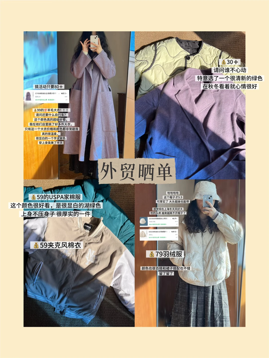 终于🍑到了便宜又暖和的秋冬外贸外套了!! 💰90➕的巨温柔的芋泥紫大衣 💰79的羽绒服 💰30➕的棉服 💰40➕的排骨风马甲! 嘿嘿买舒服了~