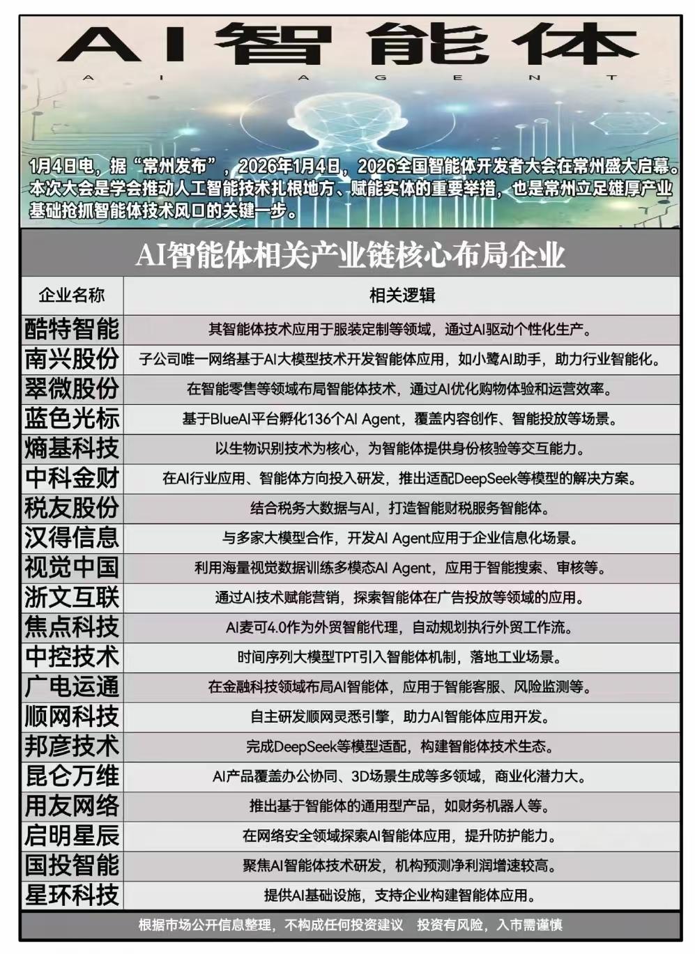 这个元旦假期AI人工智能利好纷纷来袭!相关概念分类龙头企业都有哪些? 政策利好:1月3日村里官宣,个人买AI手机、平板、智能手表、AI眼镜享最高15%补贴,机构预测AI眼镜出货量暴涨300%。 驱动事件:1月4日常州AI智能体大会发布,领军创业人才最高1000万元“拨投联动”,每年100万算力补贴。 行业前景:阿里云预判2026年初AI应用再爆发,企业AI预算将达当前IT预算10倍,智能硬件、金融、制造等落地加速。 行业龙头代表:2026 AI+主线核心梳理来了!配图名单聚焦谷歌、OpenAI、阿里、华为等头部AI主体,梳理出与之关联的核心标的,覆盖软件、硬件、数据服务等多个AI应用赛道。(细分龙头名单见配图一) 不过要注意,数据仅作科普参考,理财有风险,投资需谨慎,切勿盲目跟风哦。AI算力板块 AI市场分析 AI 行业分析 AI产业机会 AI市场动向 智能眼镜AI