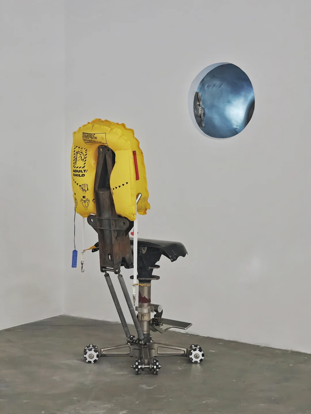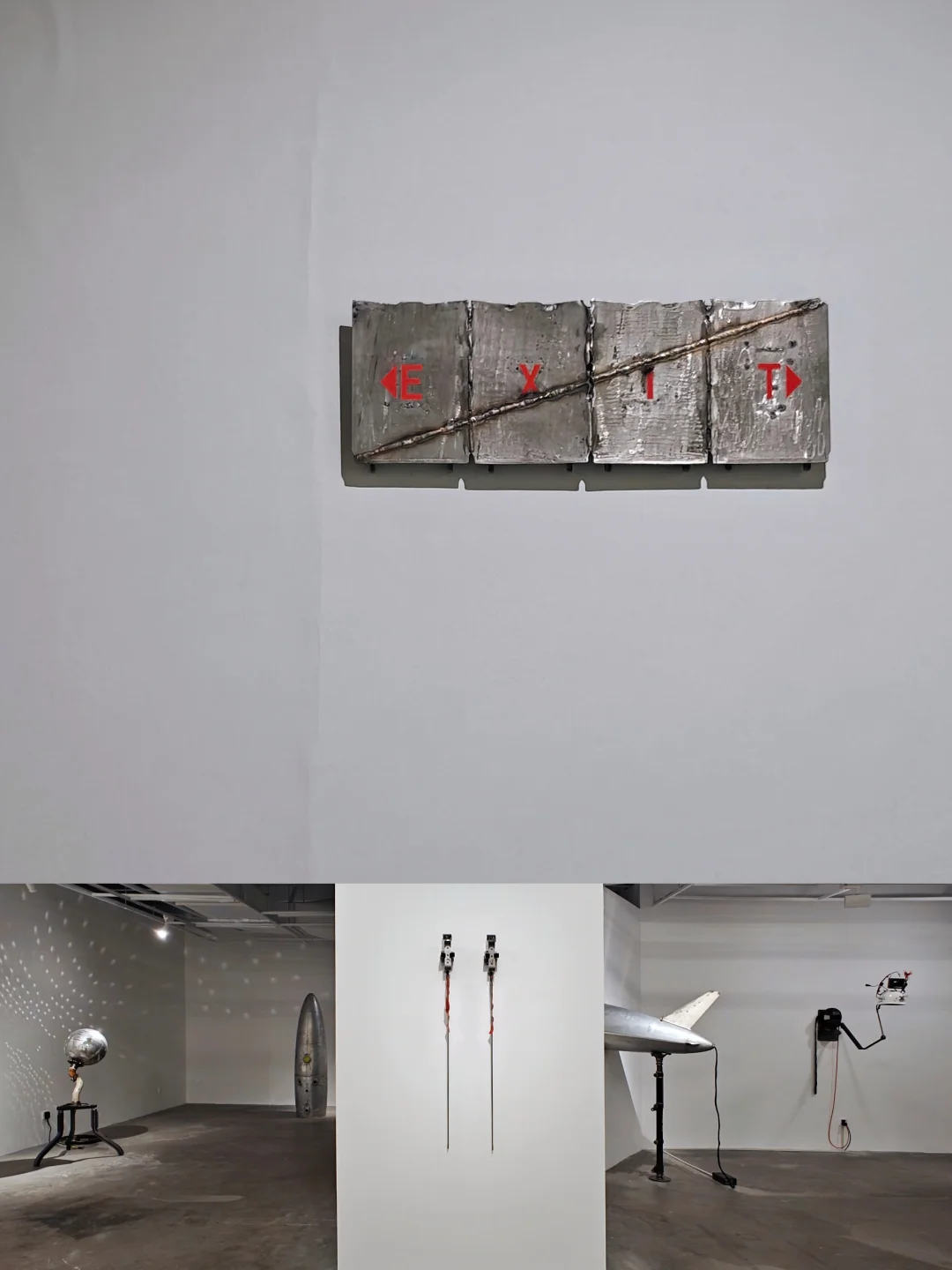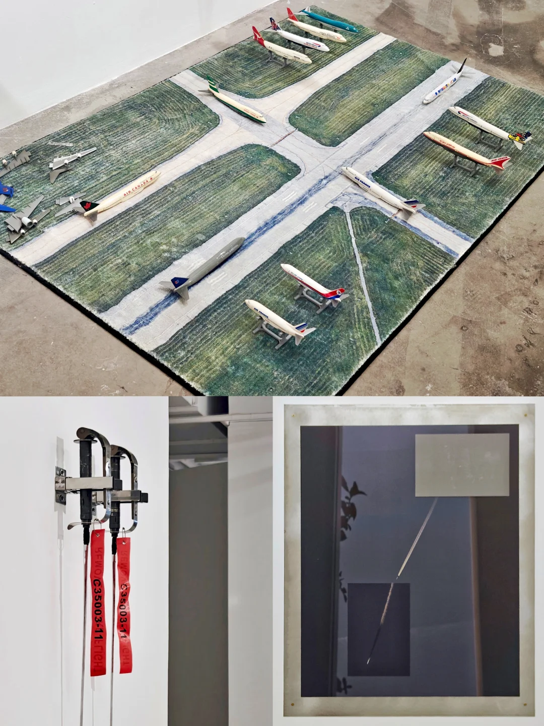 ✈️作品通过奇异的并置——如战斗机部件与民航安全指引和甜蜜的置换——如弹链与奶油气瓶,捕捉与展现暴li装置被日常驯化、嵌入基础设施的过程