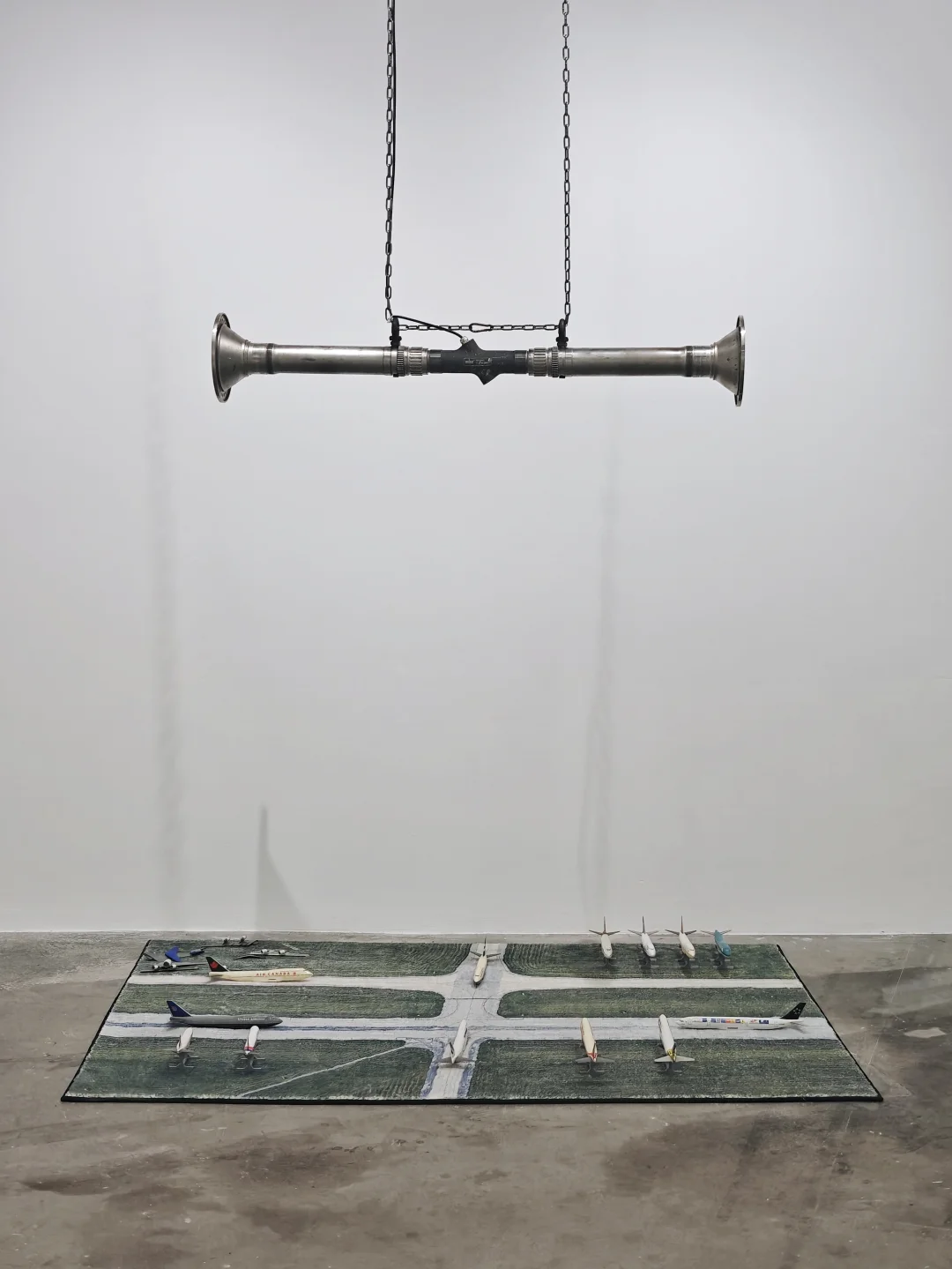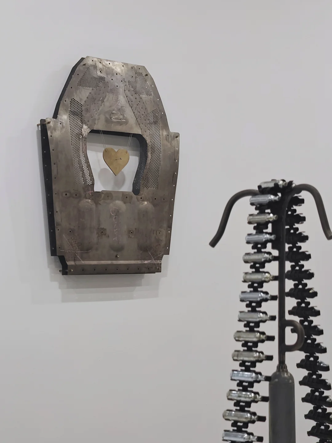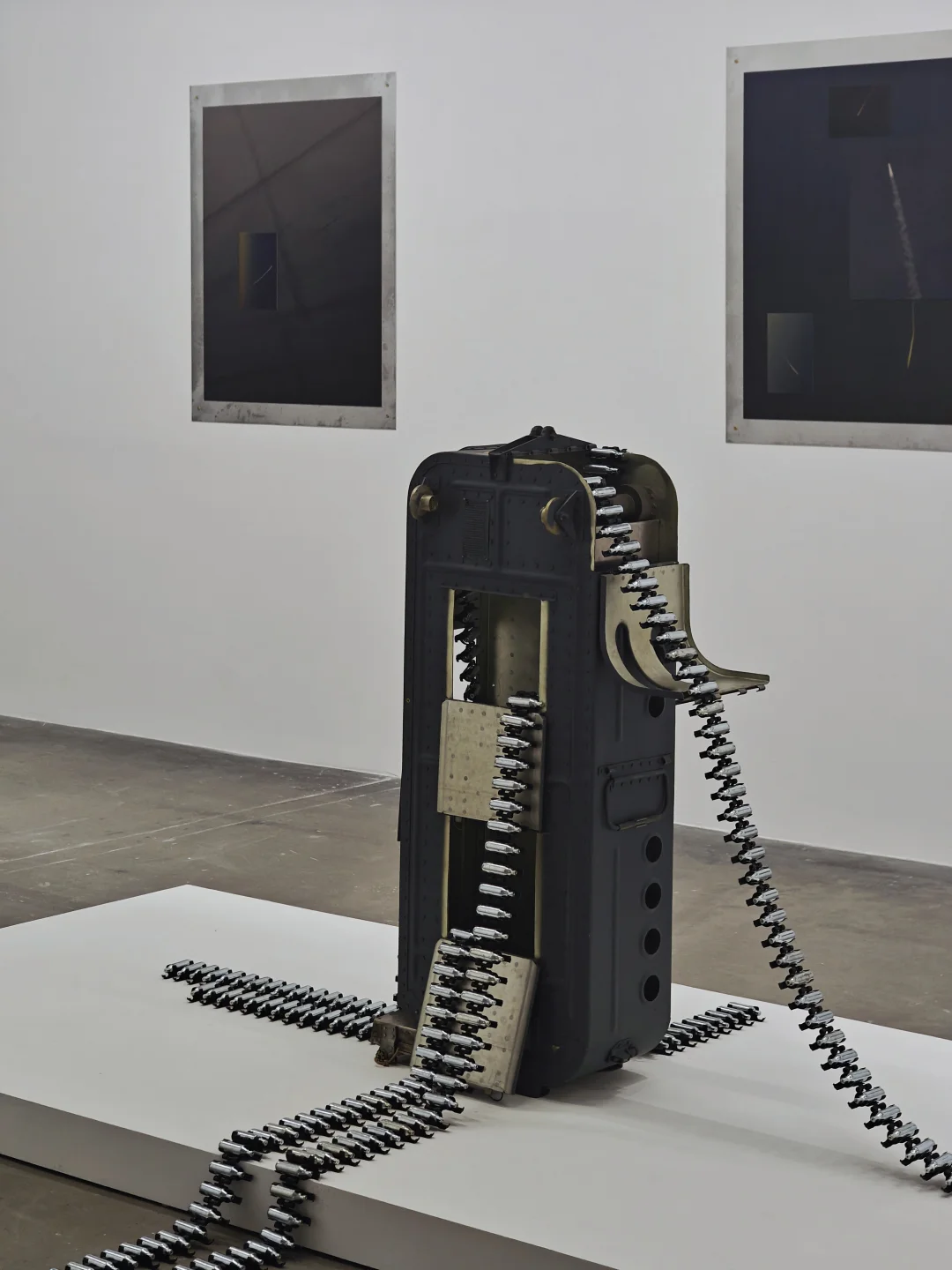 ✈️作品通过奇异的并置——如战斗机部件与民航安全指引和甜蜜的置换——如弹链与奶油气瓶,捕捉与展现暴li装置被日常驯化、嵌入基础设施的过程