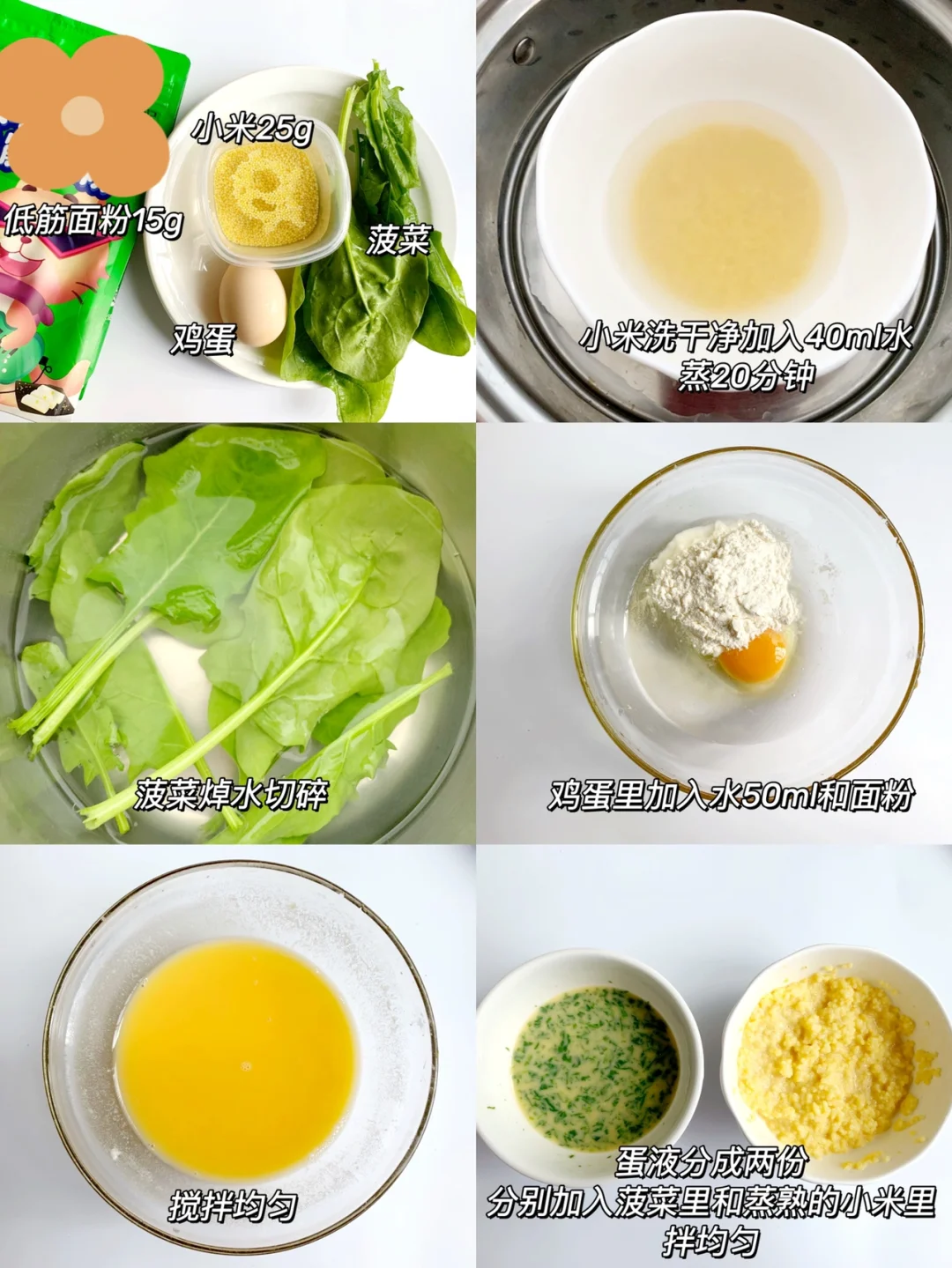1⃣️小米洗干净,加入40毫升水蒸25分钟,菠菜焯水切碎