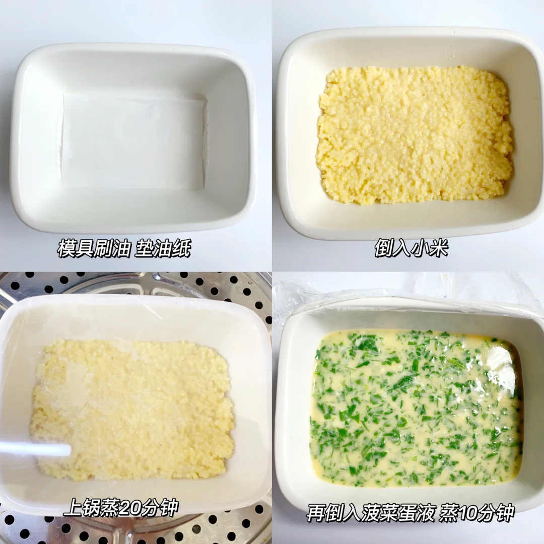 4⃣️模具刷油,垫油纸,先倒入小米糊,上锅蒸15分钟,再取出来倒入菠菜蛋液,上锅蒸10分钟即可,取出晾凉脱模