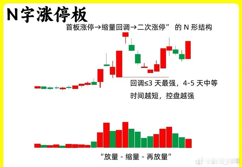 注意了!如果让我说一个最为强势的形态,那我说是N字型涨停。是短线最为强势的形态之一了,简单来说就是主力强势建仓以后洗盘再到洗盘结束的一个过程。如果你也是短线选手,那这期内容就一定要认真看完还是老规矩,点赞收藏或评论“518”支持一下,每天分享炒股干货,以免以后想温习找不到了。一、股价在低位的时候,主力强势介入,放量突破横盘阶段的平台上沿,这是底部的首个涨停板,成交量出现倍量二、次日股价开始回调,成交量出现缩量,说明主力并没有出货,回调周期也不能太长,一般小于3天为最强,4到五天为次强,如果超过了五天,那就比较弱了。回调的时间越短,那主力控盘的能力就比较好。三、回调阶段收盘价都不要跌破首板涨停的最低价,这个一个重要支撑位置,也是主力平均持仓成本线。股价没跌破,说明此时的抛压比较小,承接力量比较强。当然了,有的主力会故意跌破支撑位,但是会立马收复,形成一个黄金坑。四、等主力洗盘完毕以后,再次出现涨停板,成交量出现放大,说明主力又开始动作,往往此时封单量,涨停时间就变得比较重要,强势是否,一目了然。成交量总的来说就是,放量到逐步缩量,再次放量的一个过程。这就是N字形态好了!今天内容就分享到这里,下方我准备了案例图,建议文章和案例图一起看,就能轻松看懂,希望对大家有启发和帮助,也是最为基础的内容,一定吃透。