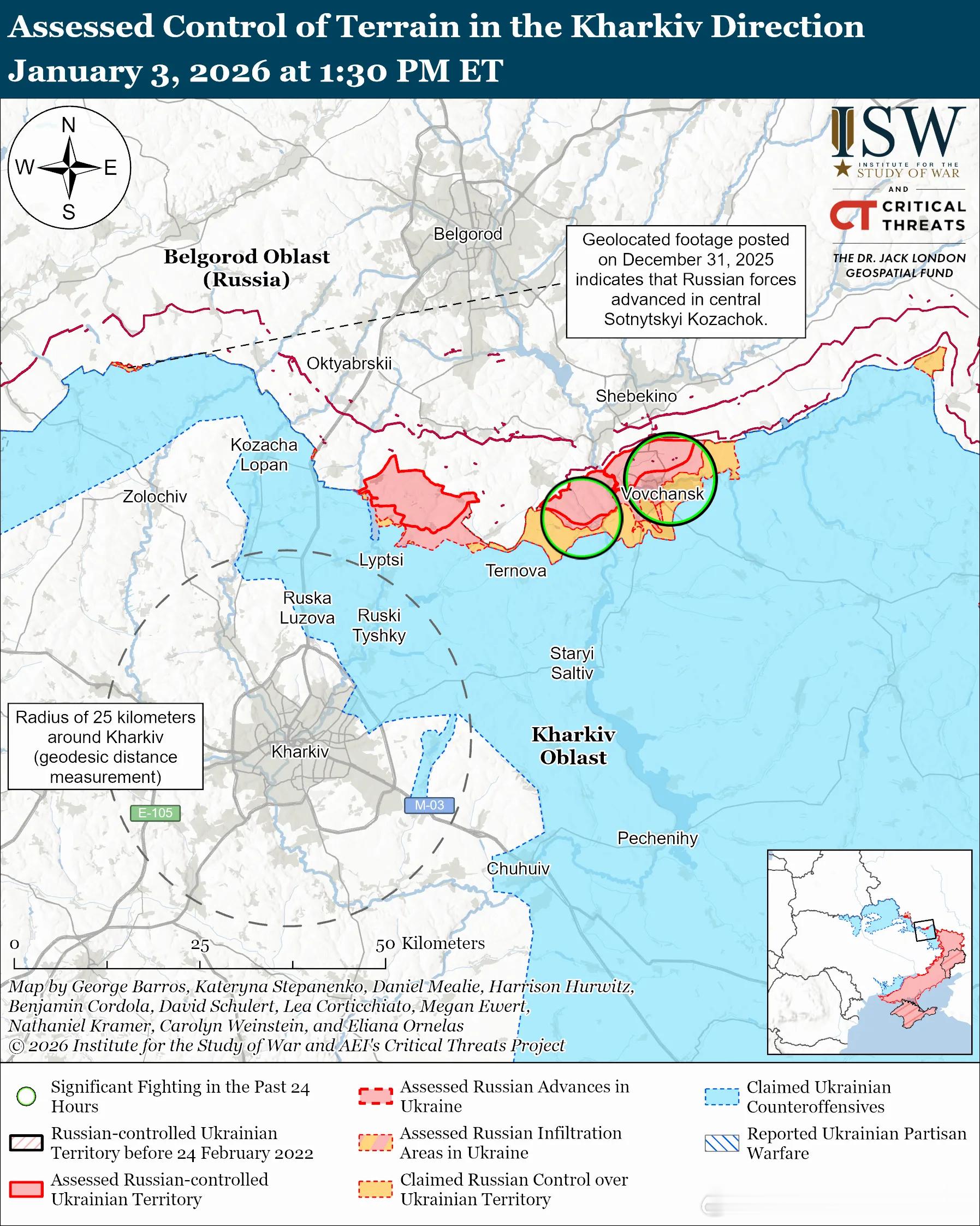 俄罗斯主要行动:乌克兰东部俄军主要行动1俄罗斯的目标:将乌克兰军队从与别尔哥罗德州接壤的国际边界击退,并使其进入哈尔科夫市的管式火炮射程之内。俄军近期在哈尔科夫州北部取得进展。评估俄军进展:12 月 31 日发布的地理定位视频显示,俄军在索特尼茨基科扎乔克中部(哈尔科夫市西北部)取得了进展。俄军于 1 月 2 日至 3 日进攻了哈尔科夫市东北部靠近沃夫昌斯克、沃夫昌斯基库托里、斯塔里齐亚、普里利普卡、维尔恰和莱曼的地区以及伊兹比茨克方向。俄罗斯军事博主声称乌克兰军队在沃夫昌斯基库托里附近发动反击。1月3日驻扎在哈尔科夫州北部的一个乌军旅的发言人表示,由于天气寒冷,难以长途跋涉抵达前线阵地,俄军上周减少了在沃夫昌斯克—德沃里昌斯克(大布尔卢克东南)地区的进攻次数。该发言人还表示,该地区不断扩大的争议“灰色地带”以及俄军集结兵力的努力也可能是导致俄军进攻次数减少的原因。1月2日和3日,俄军继续在哈特尼附近的韦利基布尔鲁克东北部发动进攻,但并未取得进展。